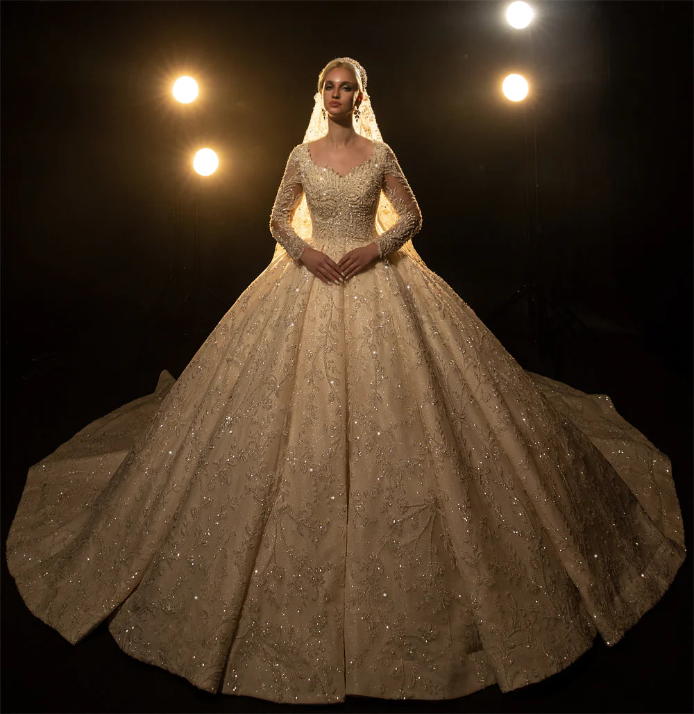 Nine Seven Long Sleeves Sparkly Sequin Lace Appliques Square Neck Bridal Ball Grown Wedding Dress Customization