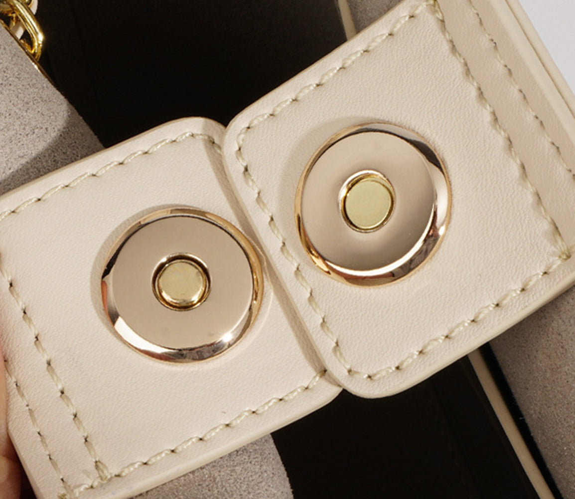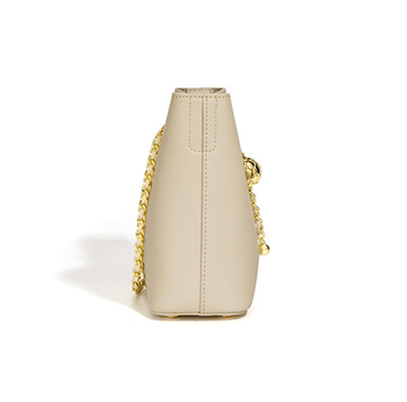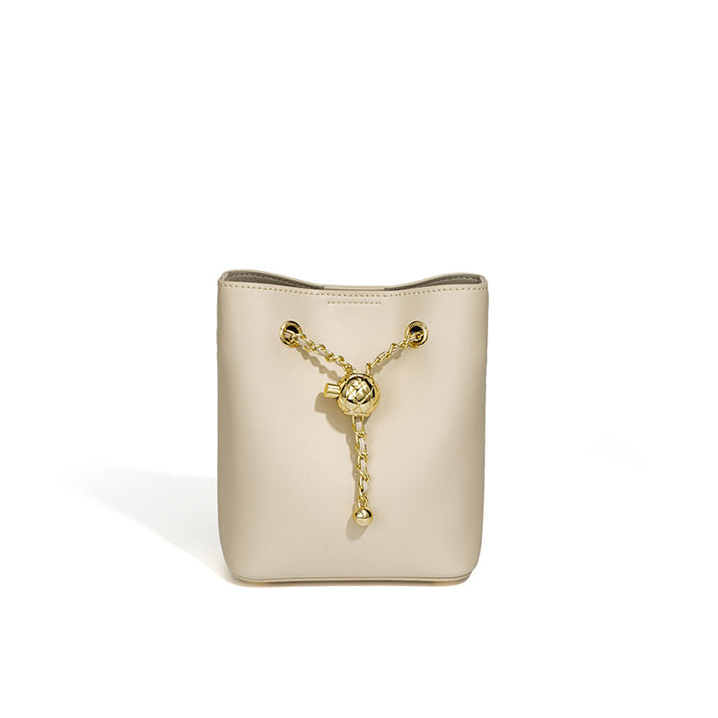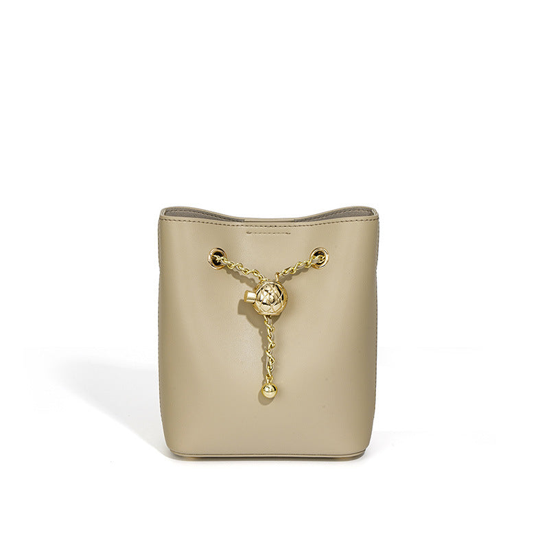 Mini bucket bag features in genuine leather and metal ball decor. It can be a shoulder bag or crossbody bag. This bag fits your phone, perfume, mask, make up, keys and a few other things.