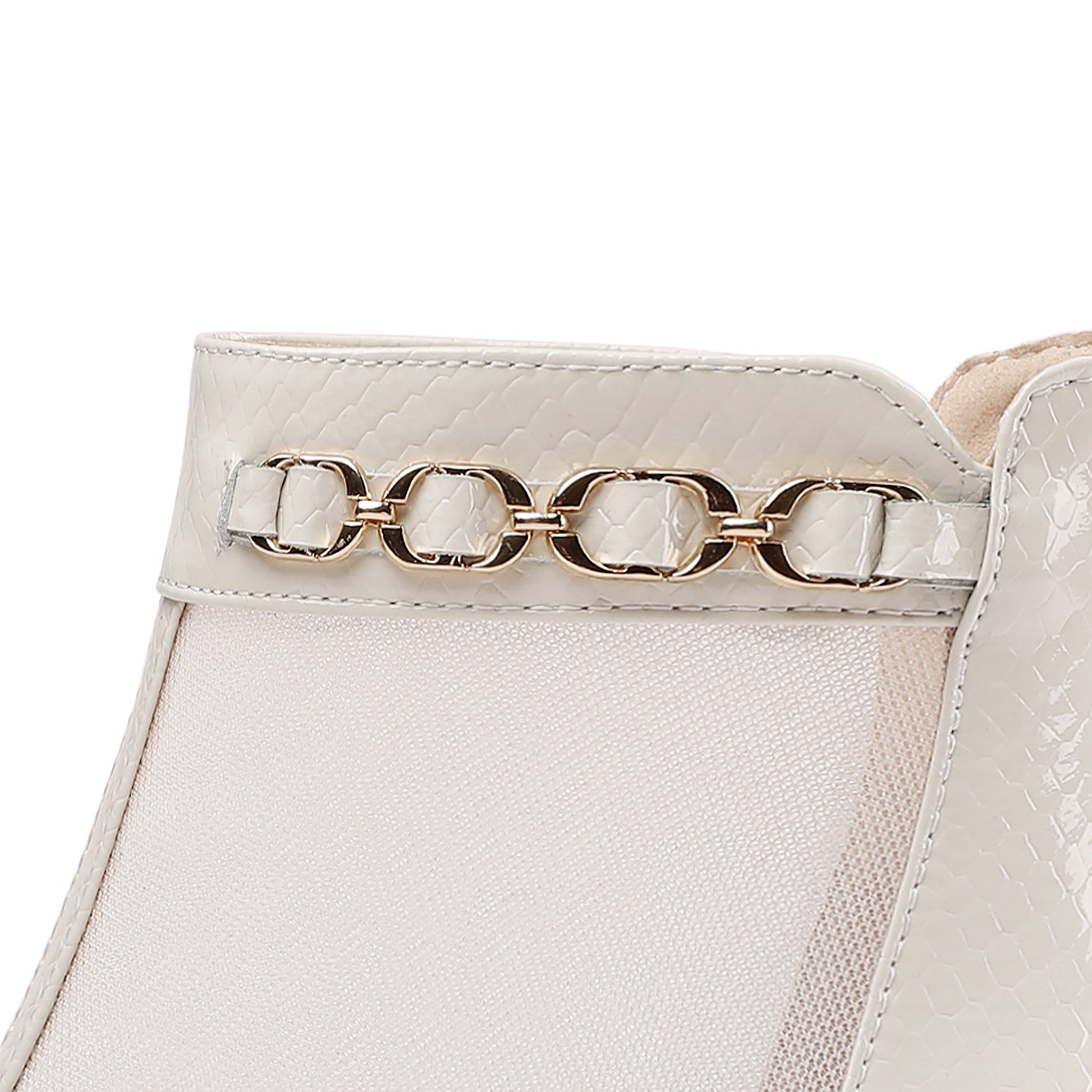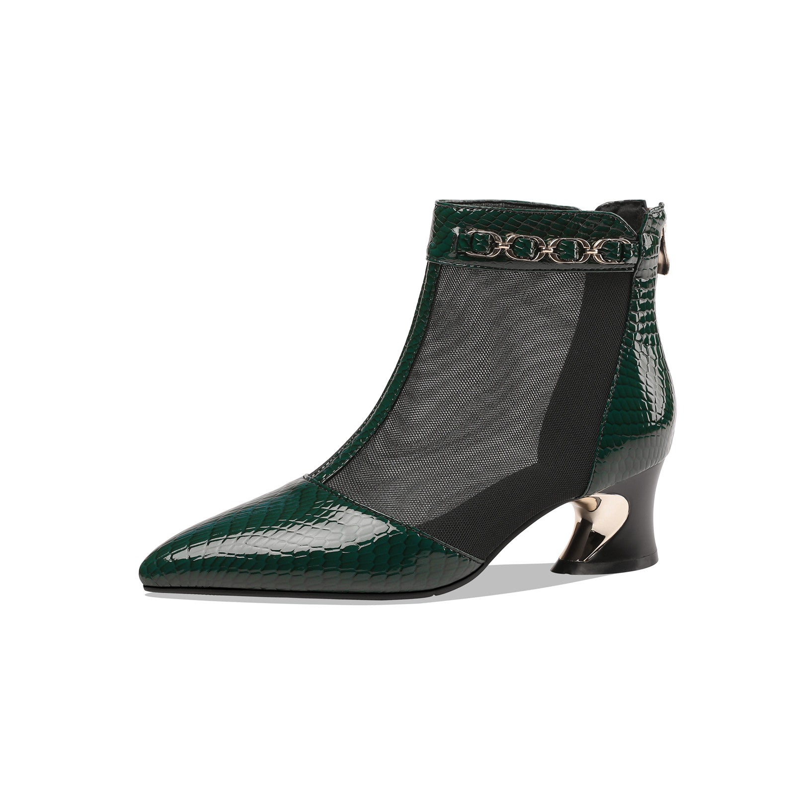 Stylish summer boots are designed with genuine leather and mesh, pointed toe, zip and chain decor.These boots could go with different outfits.