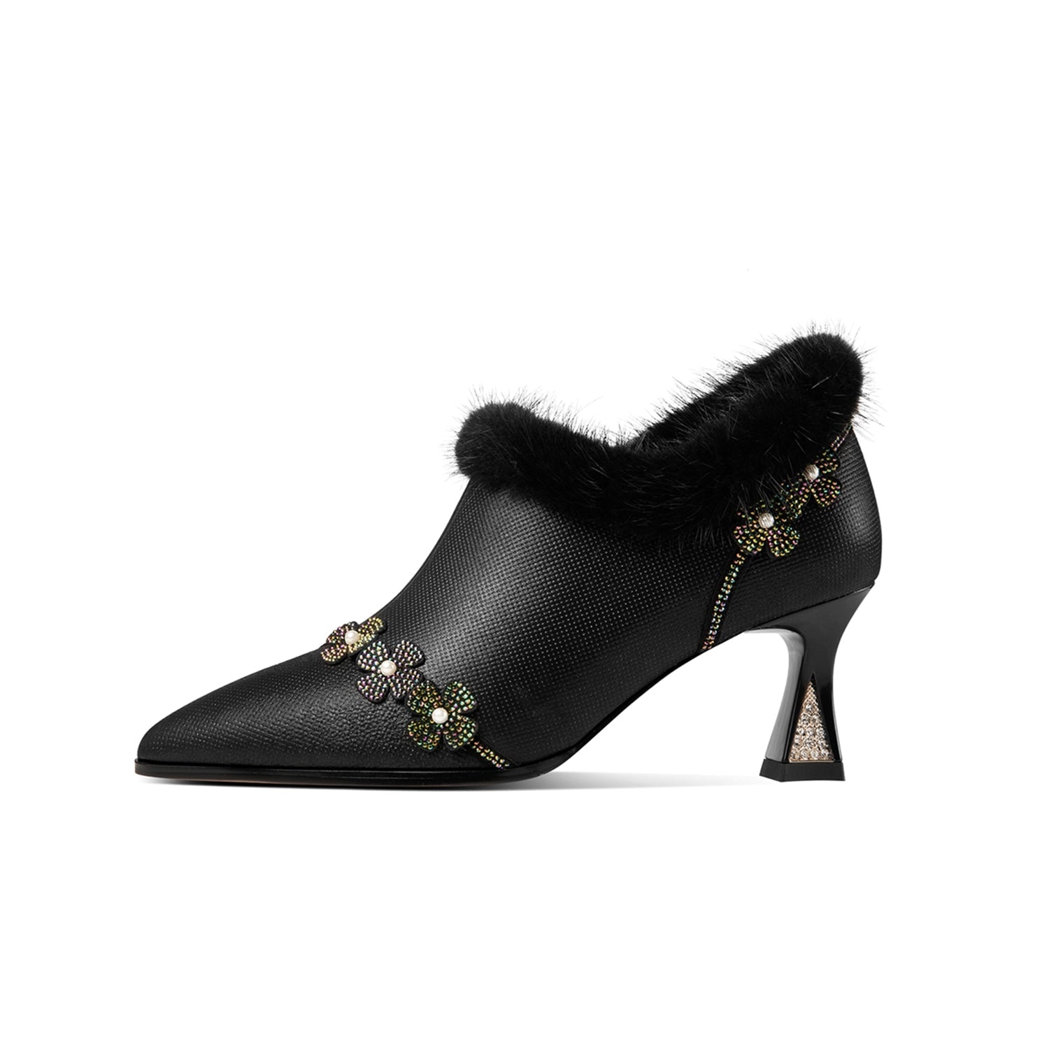 Nine Seven Handmade Women's Genuine Leather Furry Floral Side Zip Pointed Toe Mid Spool Rhinestone Heel Pumps