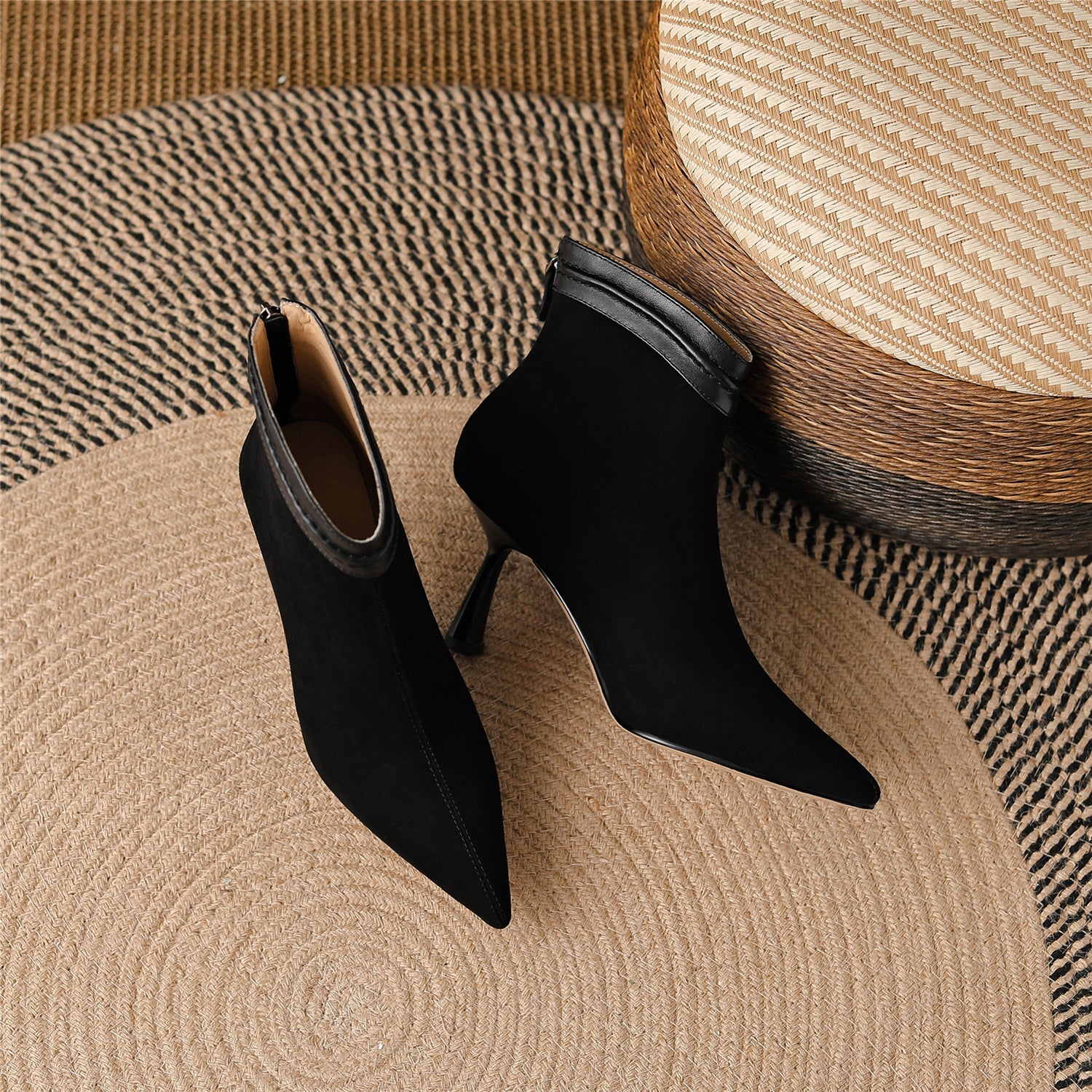 Nine Seven Handmade Women's Suede Leather Slip On Pointed Toe High Kittened Heel Back Zipper Ankle Boots