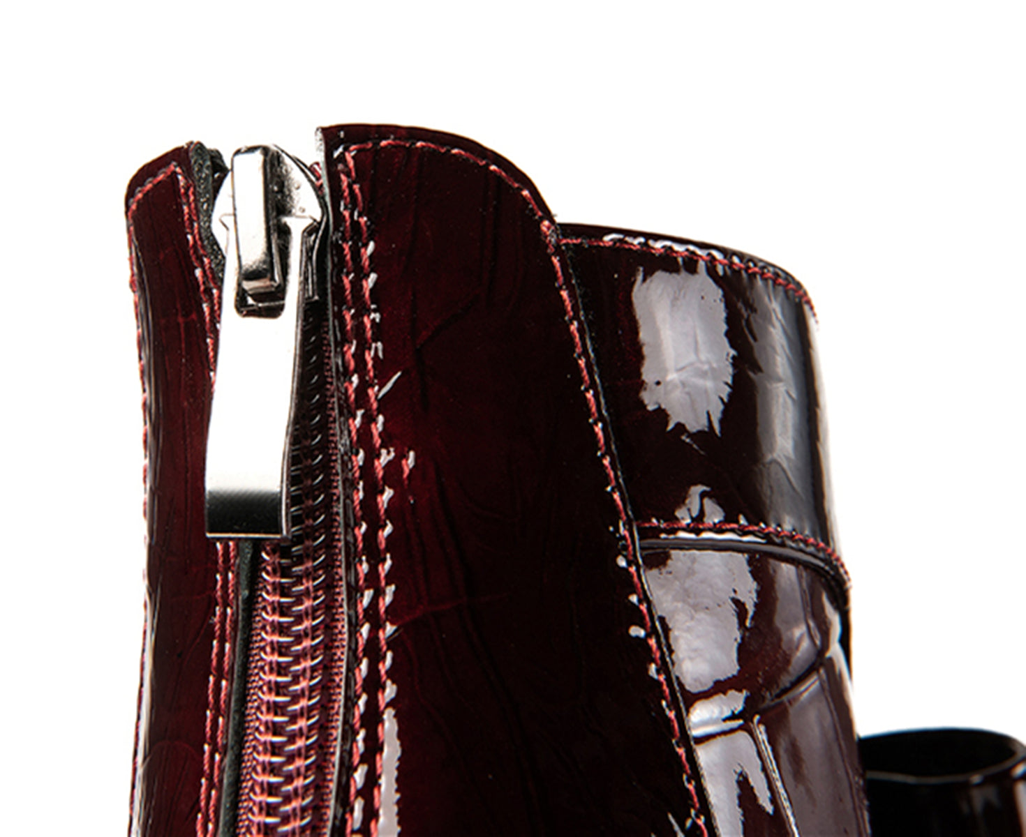 Glossy ankle boots are designed with patent leather, pointed toe, zip, bow and high heels.Slip-resistant sole could make you feel confident.