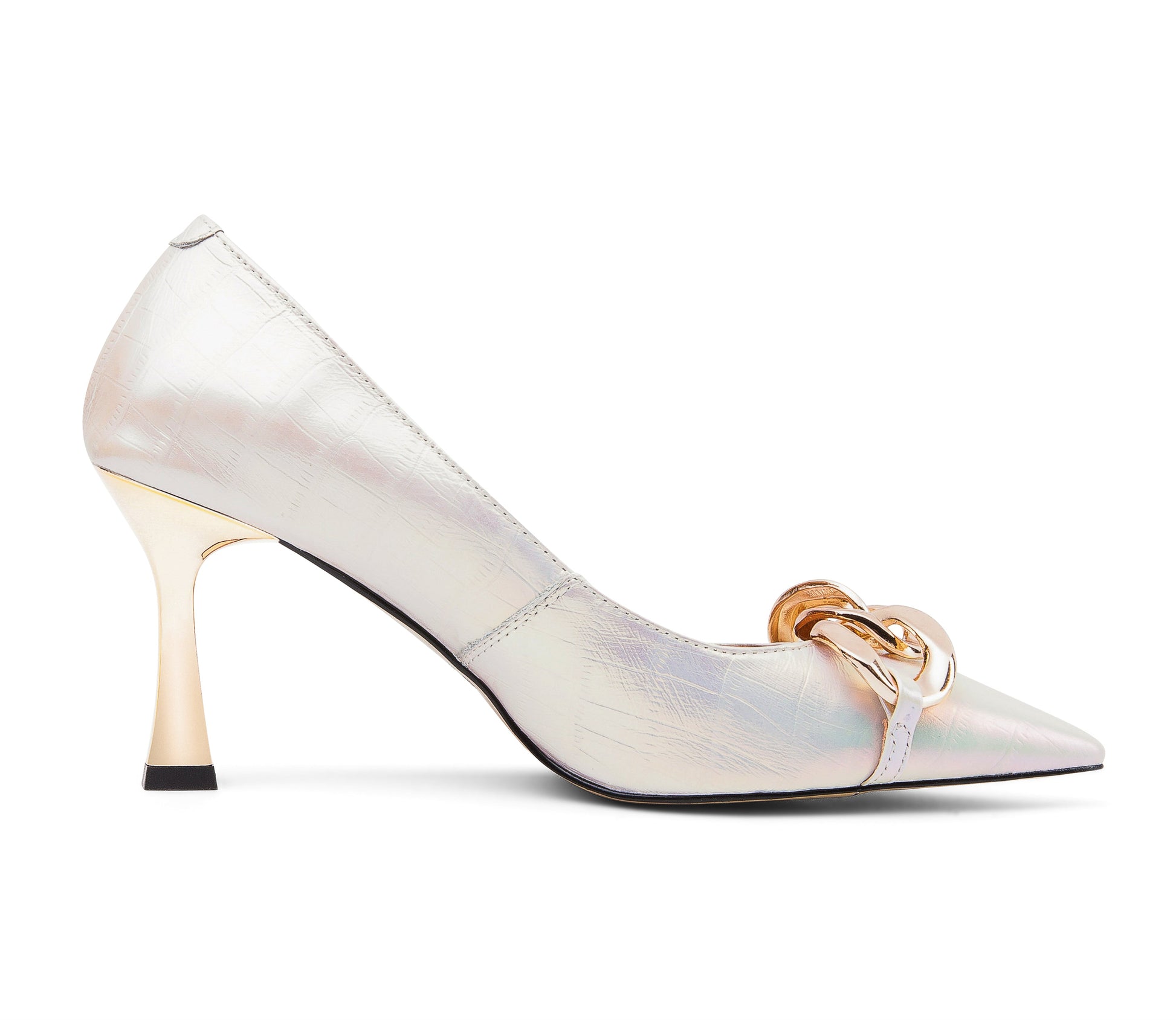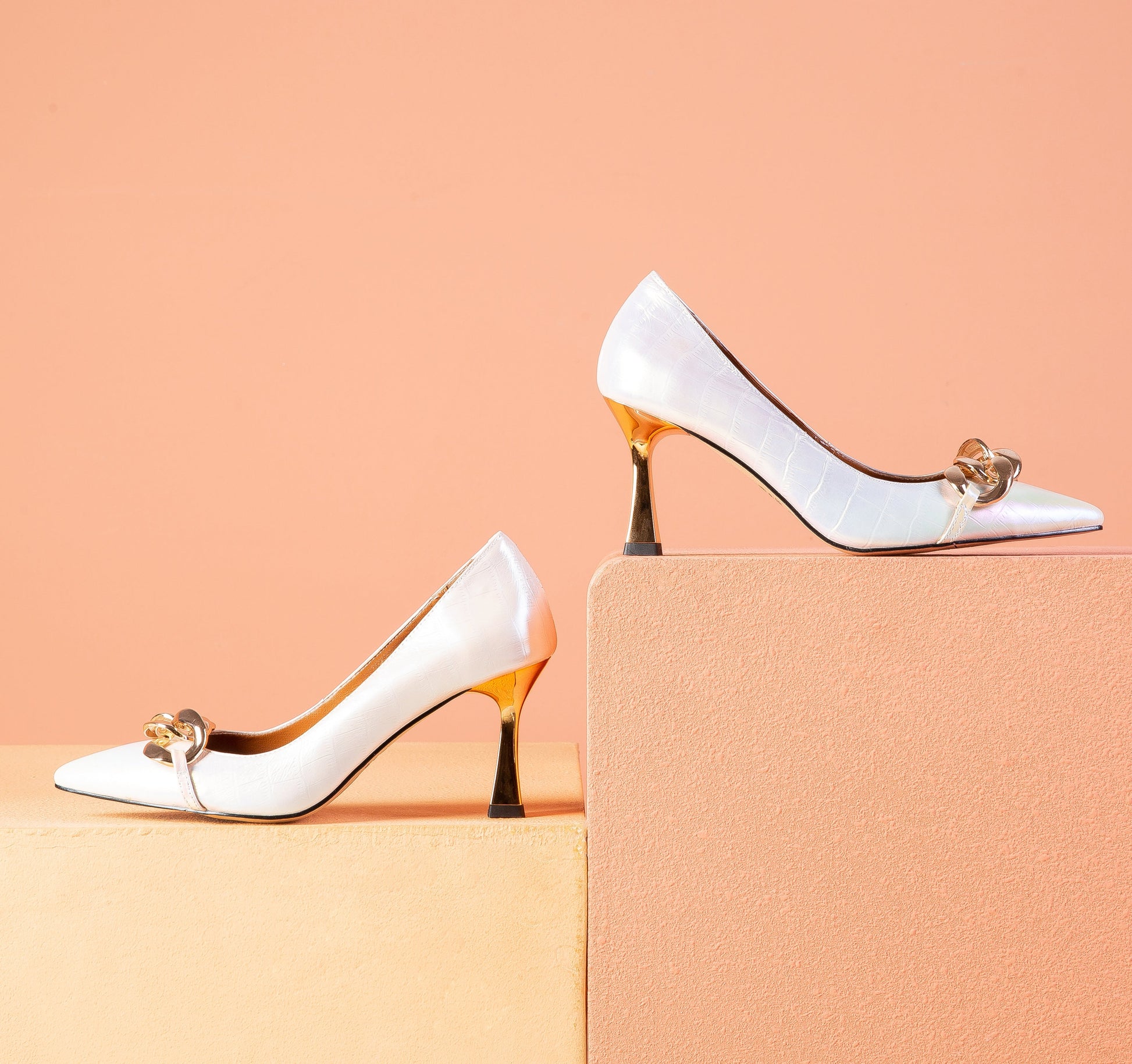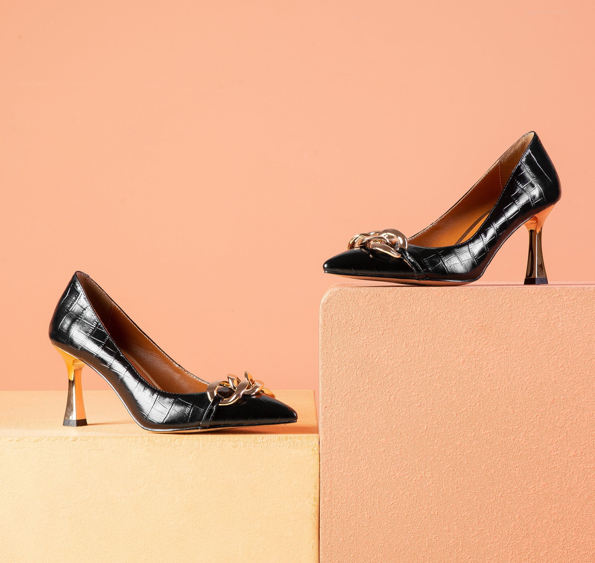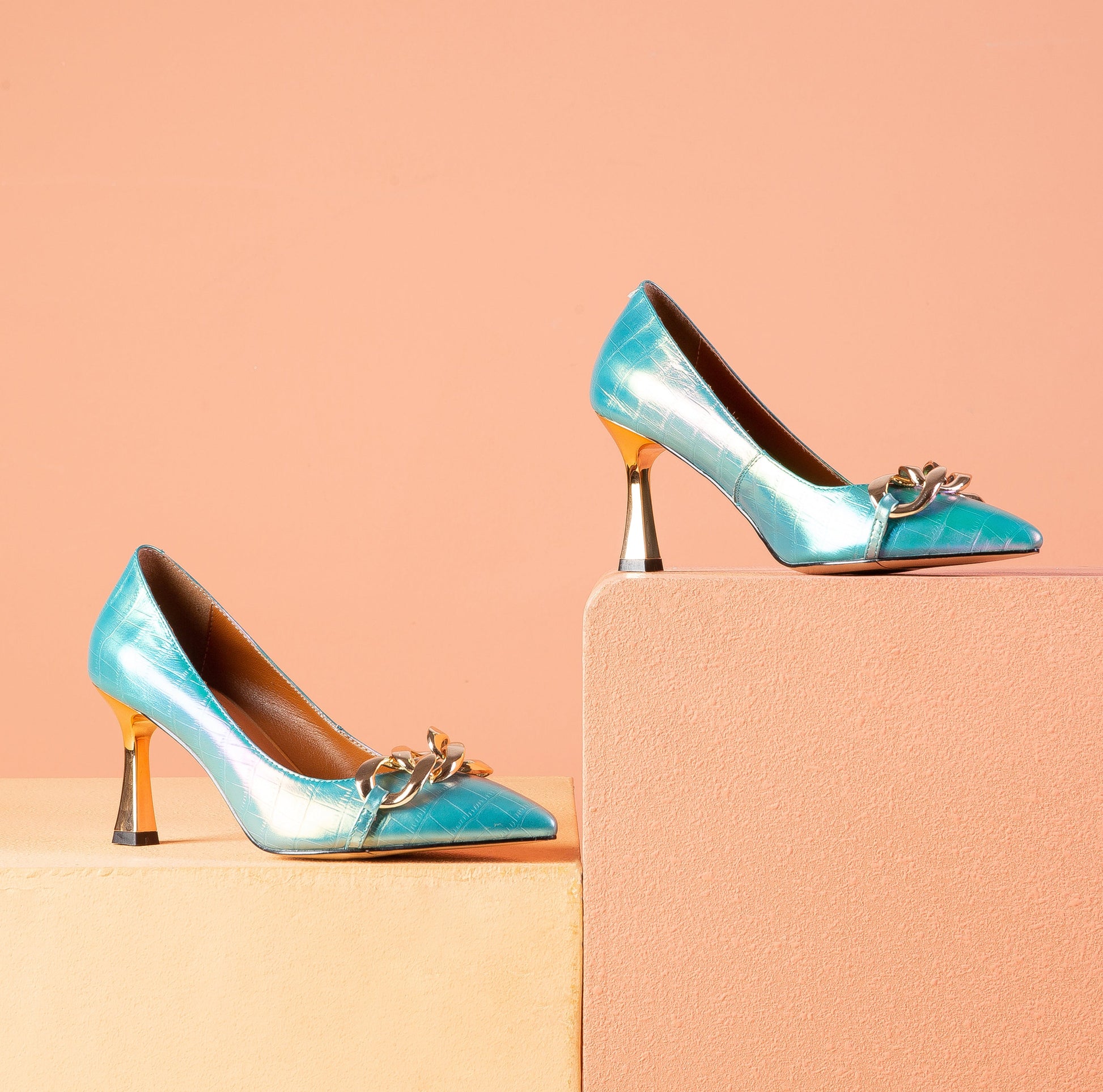 Sexy pump shoes are designed with genuine leather, pointed toe, high kitten heel, mental pattern and slip on closure to keep up with fashion trend and give you visual enjoyment.