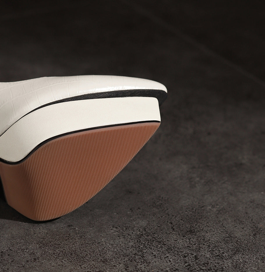 Elegant pumps shoes featured with genuine leather, pointed toe, pltform and stiletto high heels to keep up with fashion trend.