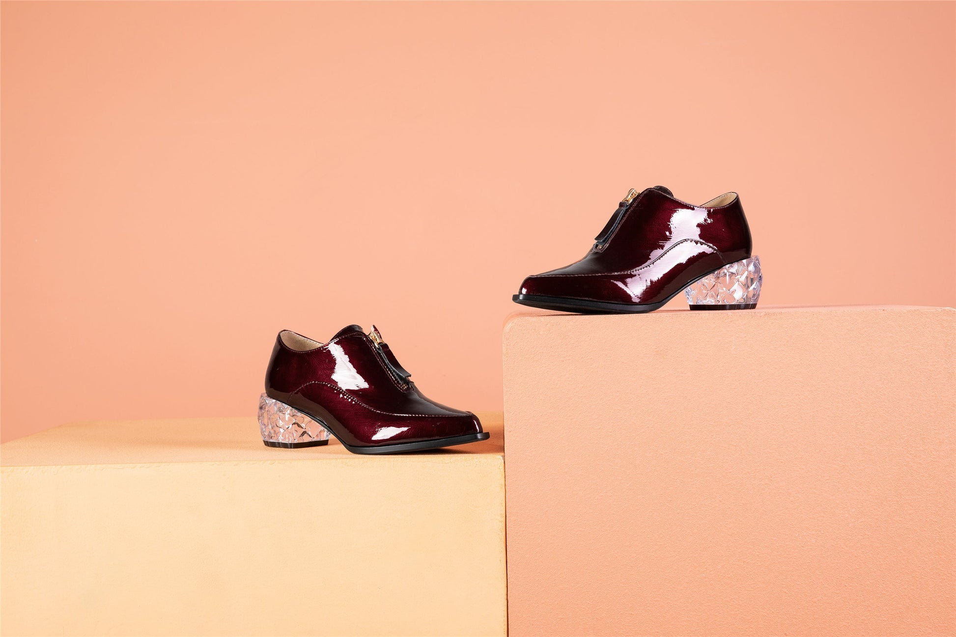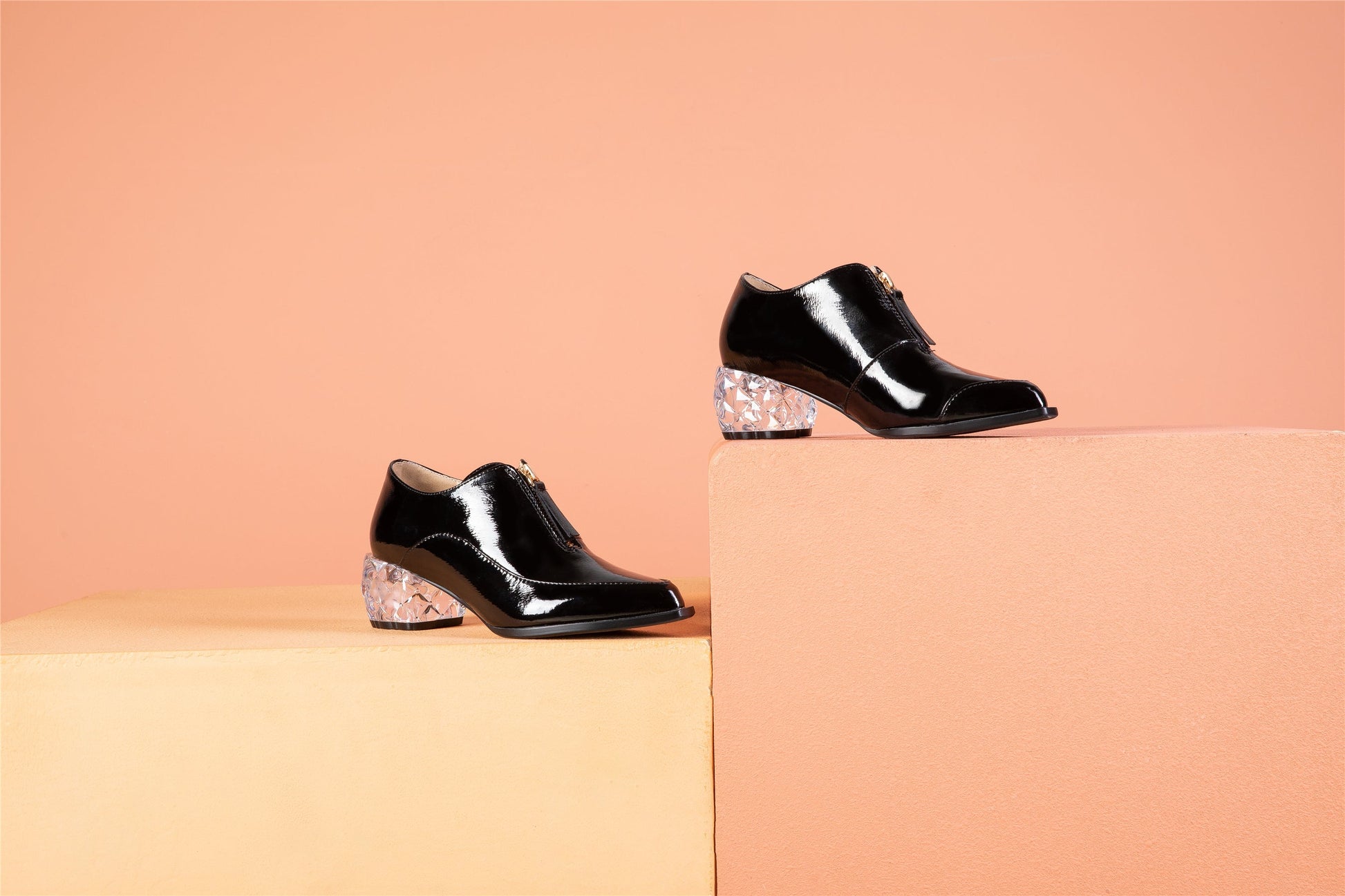 Nine Seven Women's Glossy Patent Leather Handmade Clear Pointed Toe Chunky Heel Front Zip Pumps