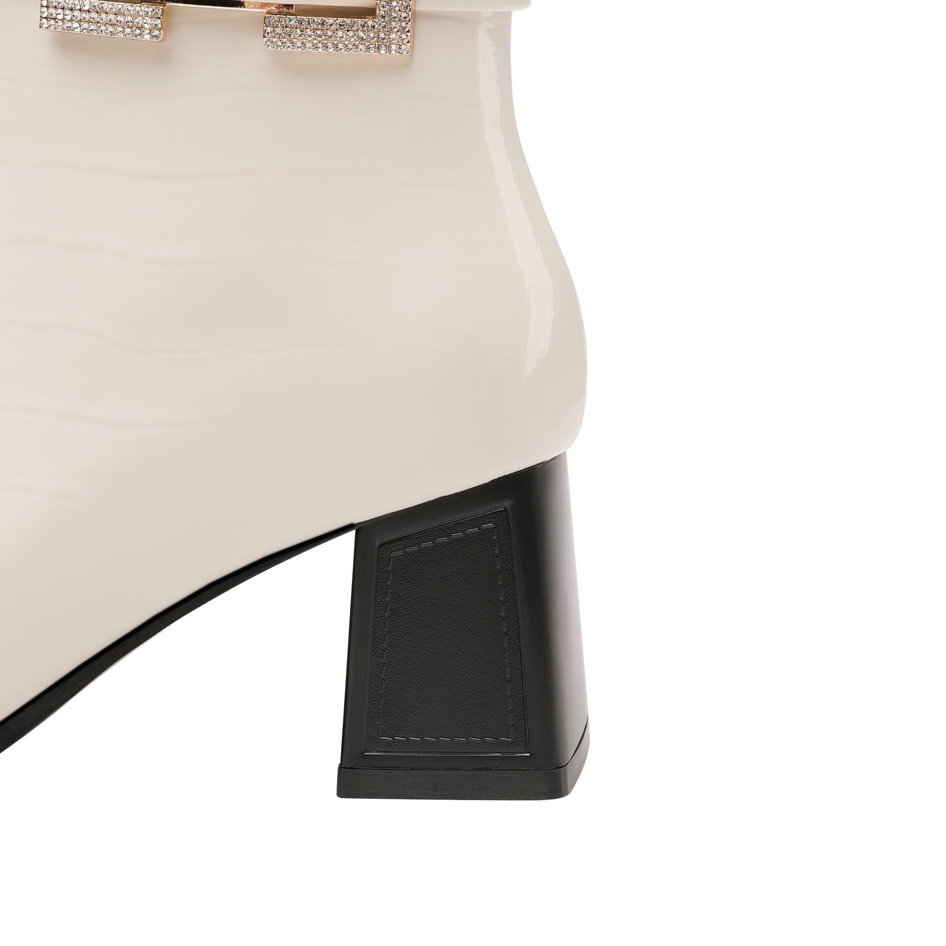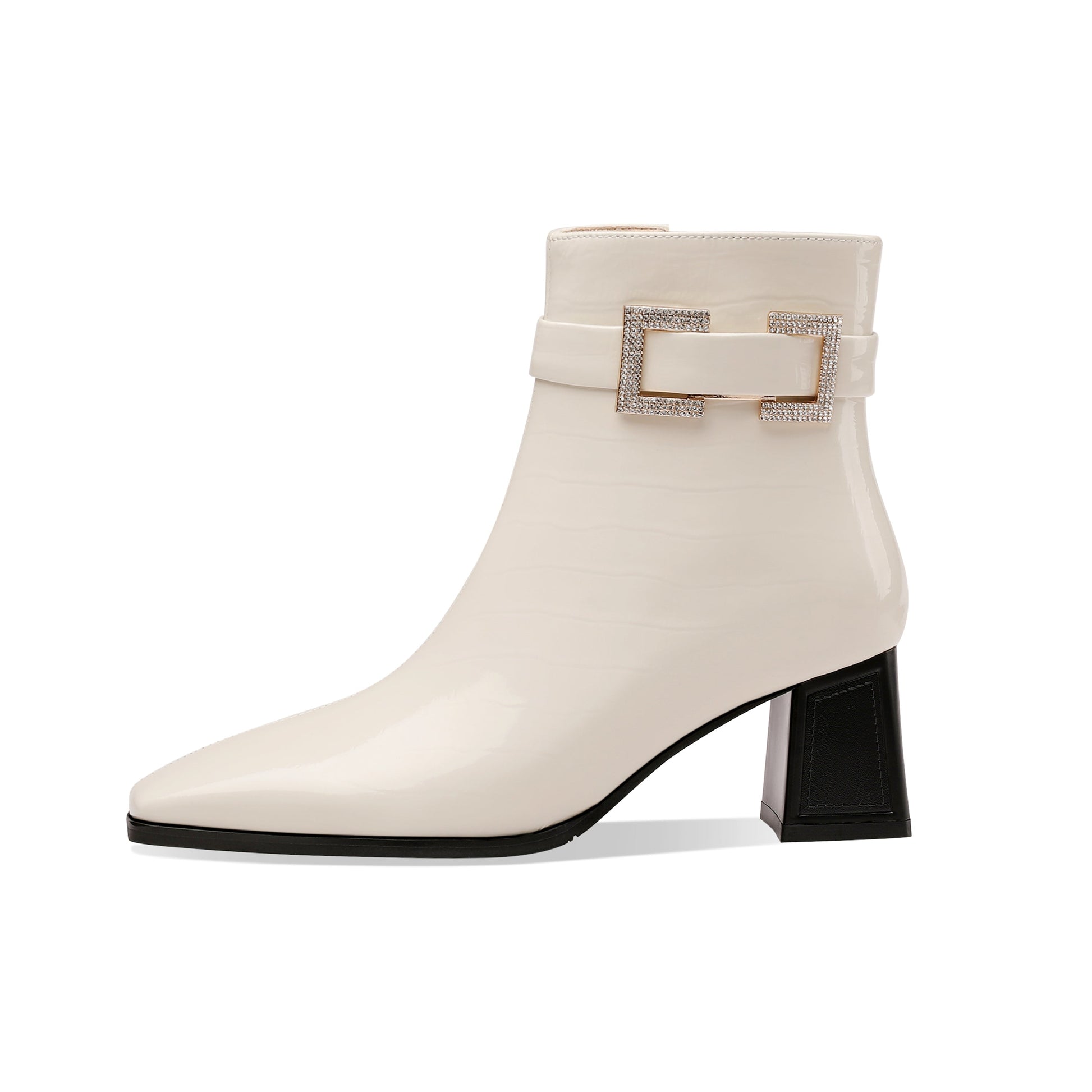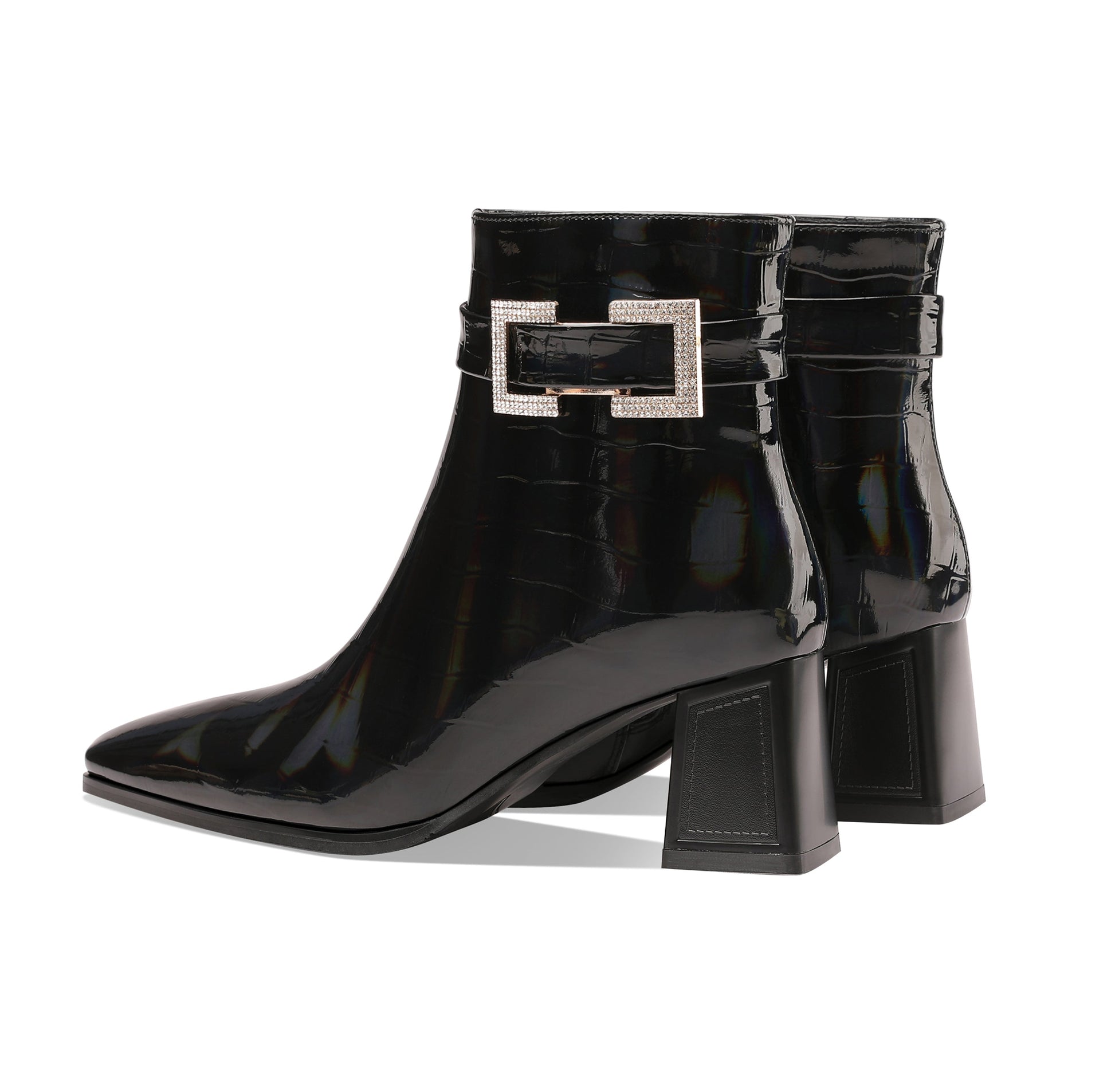 Stylish ankle boots are designed with patent leather, square toe, mid chunky heel, side zipper with exquisite buckle to keep up with fashion trend and give you visual enjoyment.