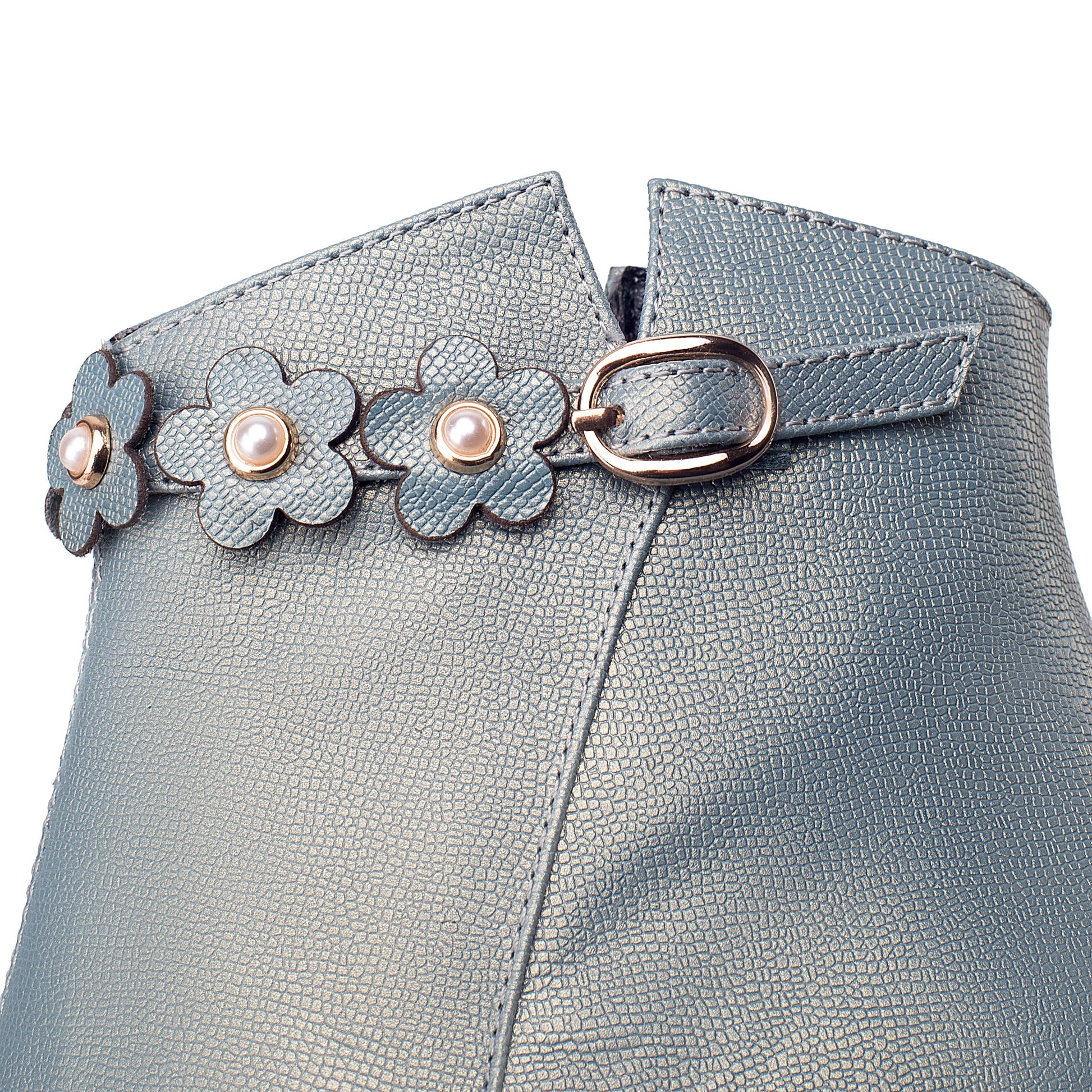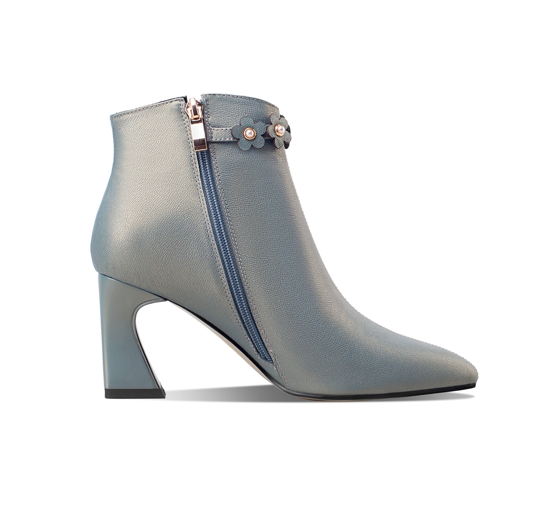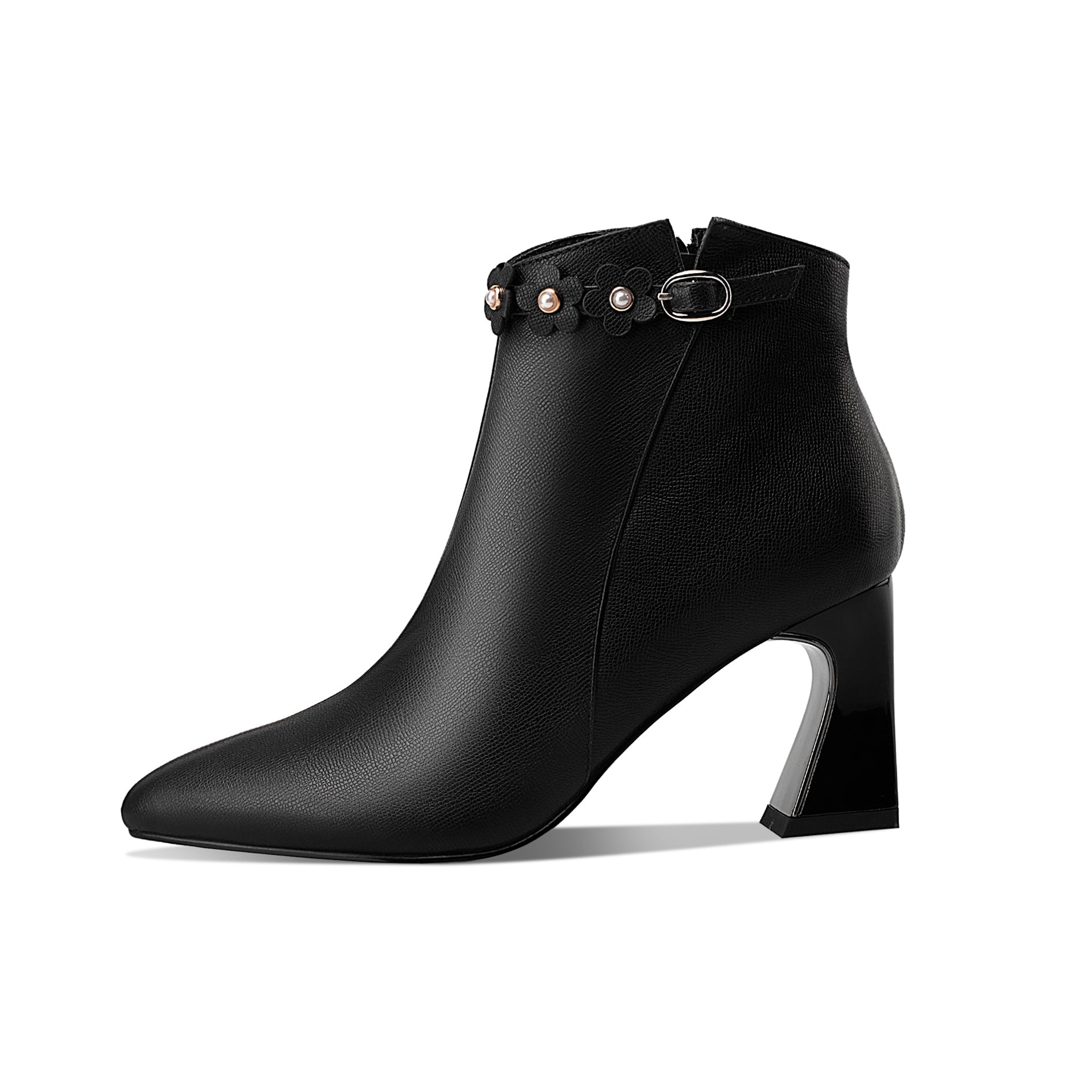 Nine Seven Women's Handmade Genuine Leather Mid Spool Heel Side Zip Up Trendy Ankle Booties with Floral Buckle Decor