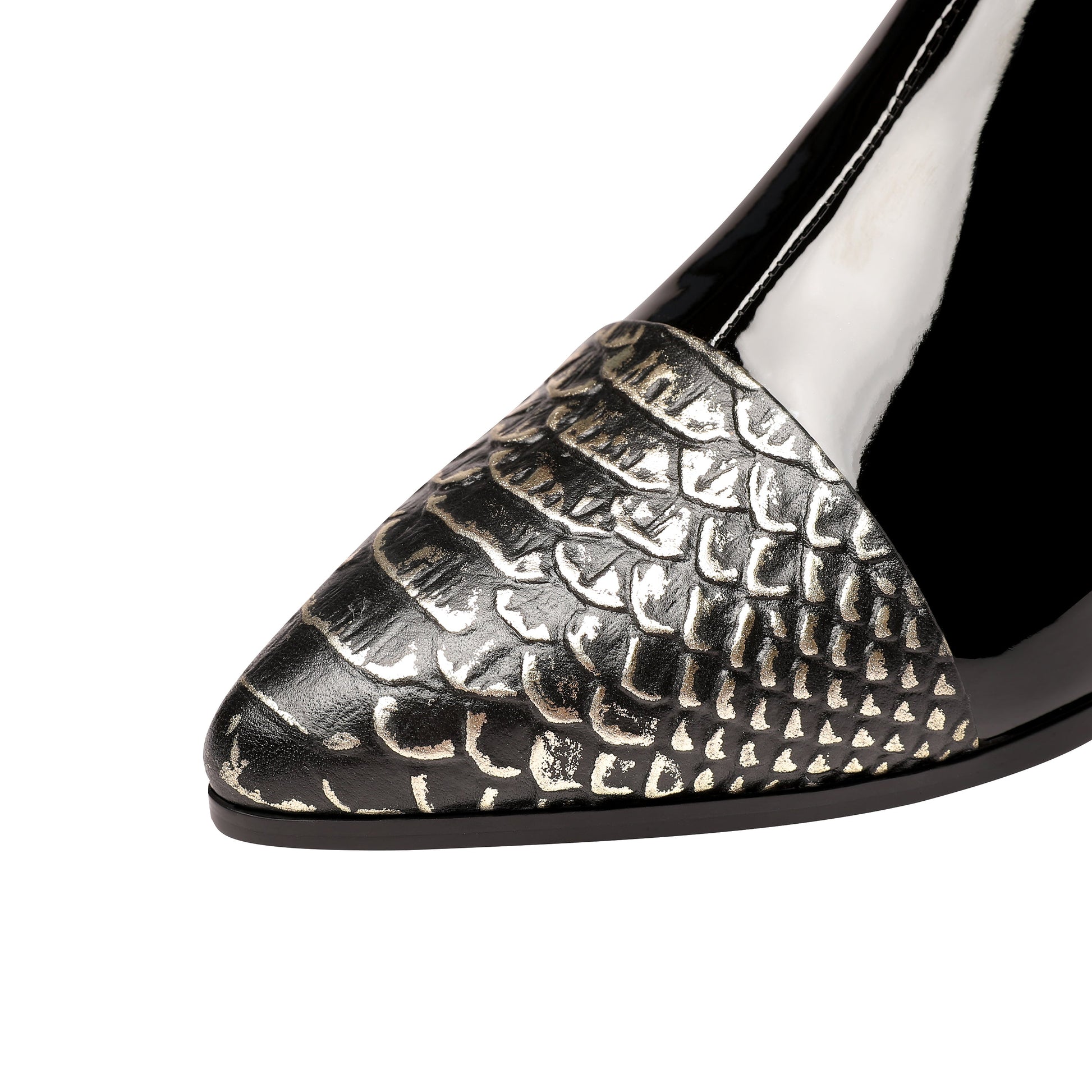 Stylish ankle boots feature in patent leather, pointed toe,buckle decor and easy side zip closure.Soft insole could make you feel comfortable.