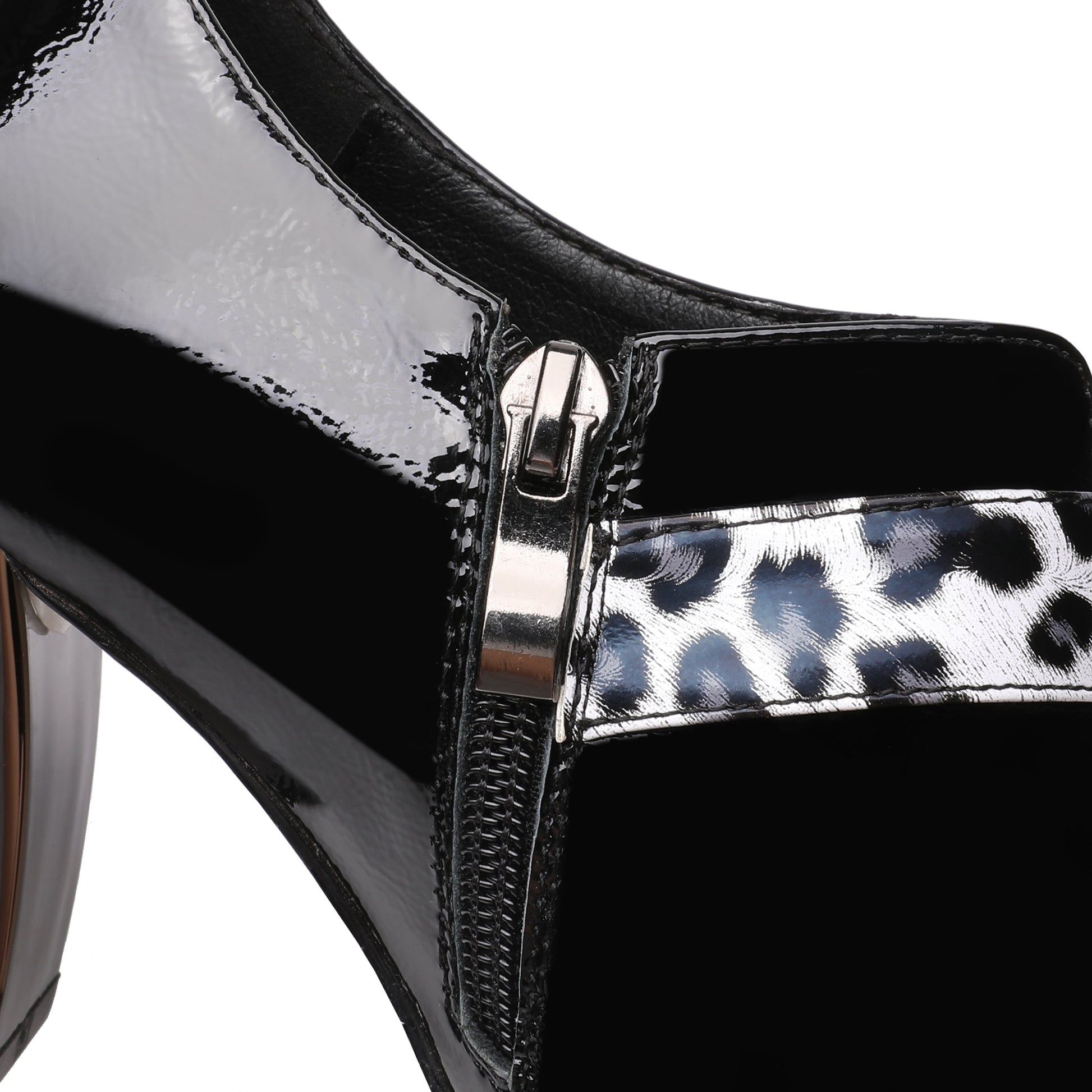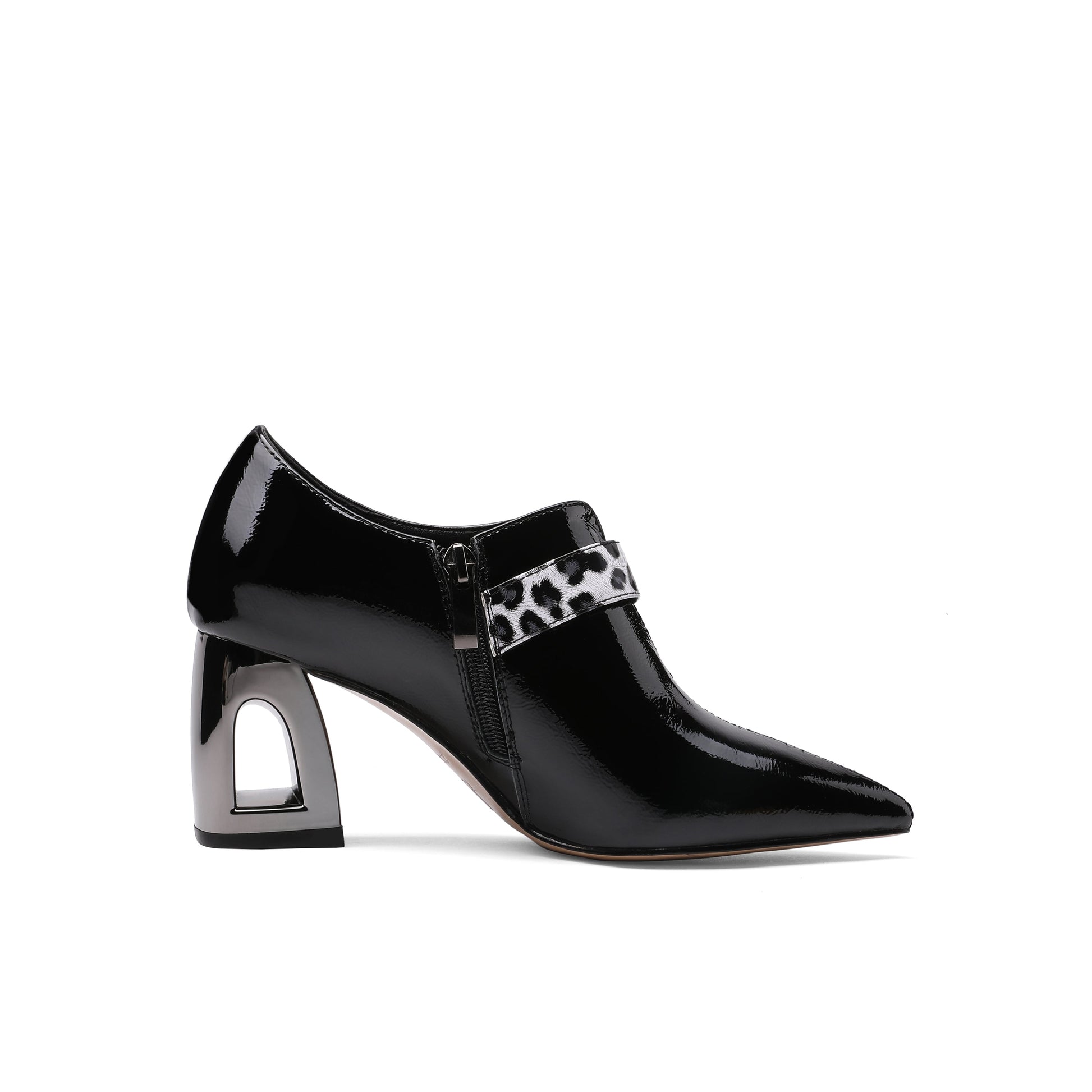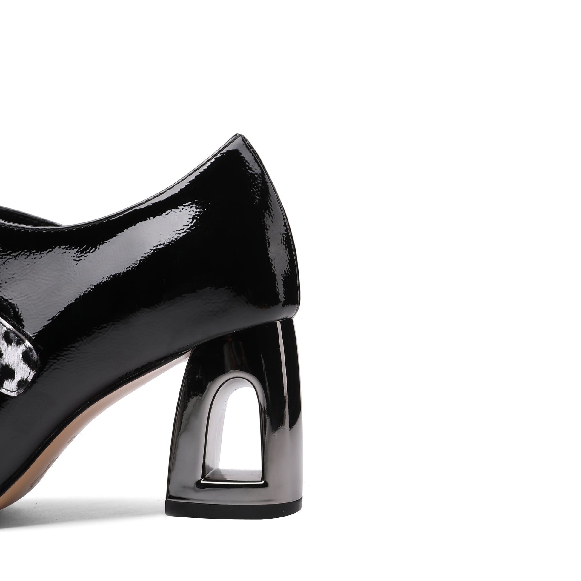 Nine Seven Women's Handmade Patent Leather Pointed Toe Mid Chunky Heel V-Shaped Side Zip Up Pumps with Modern Buckle Decor