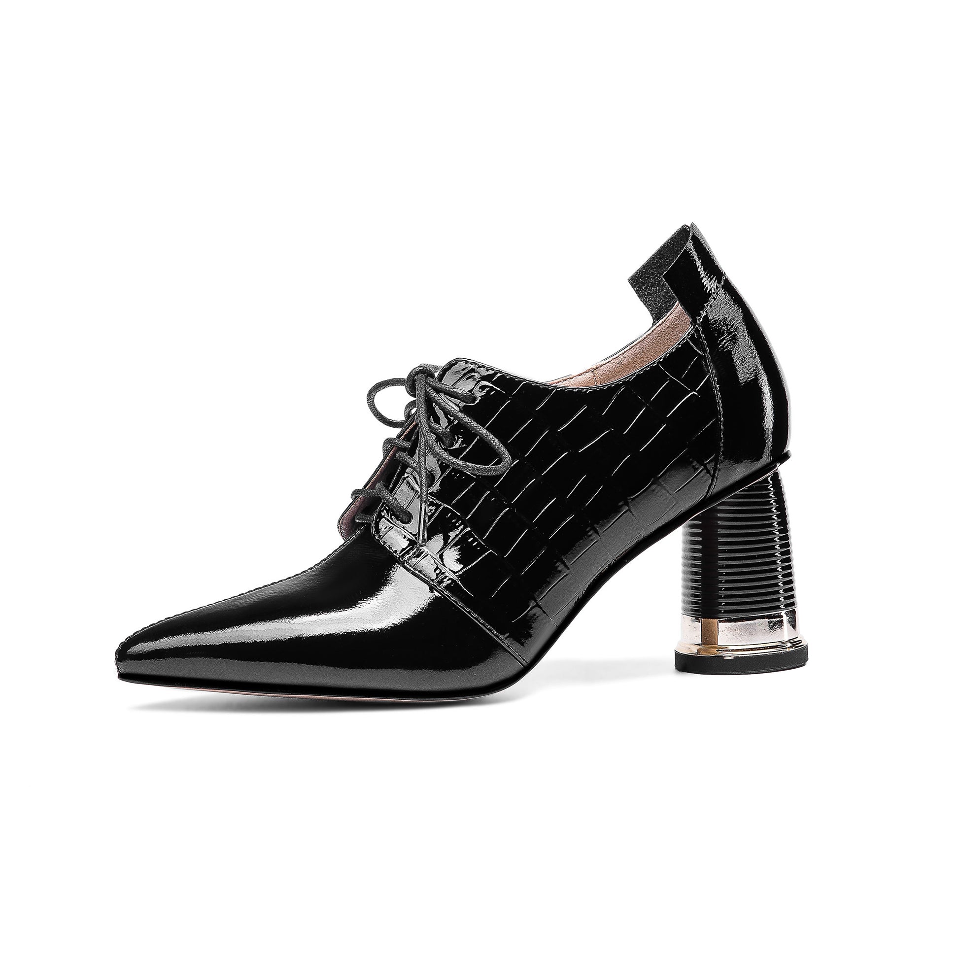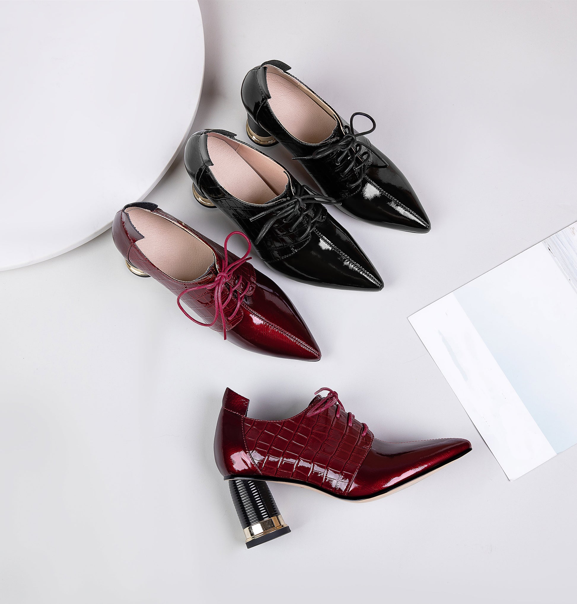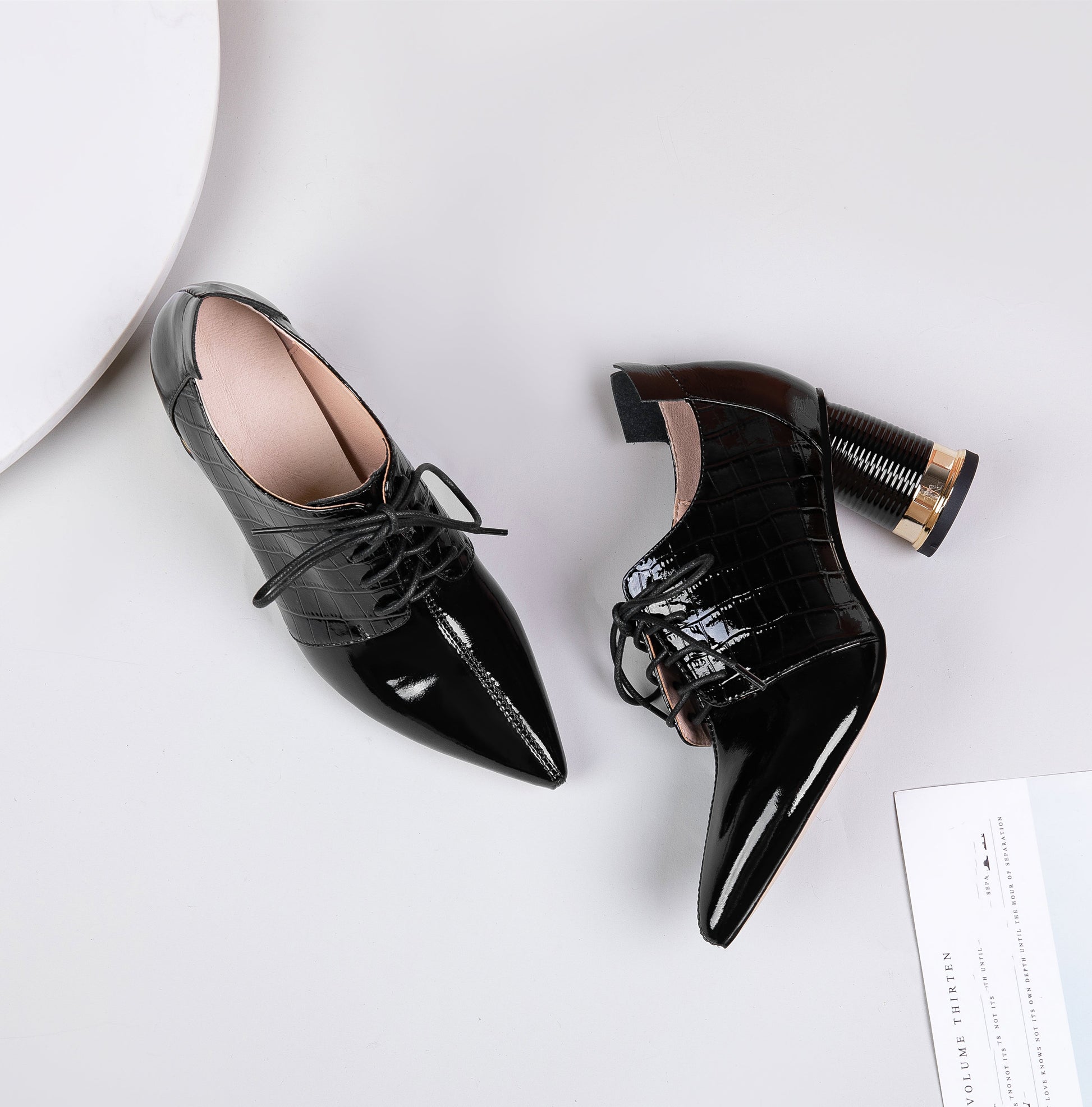 Nine Seven Women's Handmade Patent Leather Pointed Toe Mid Cylindrical Heel Lace Up Stylish Plus-Size Pump Shoes