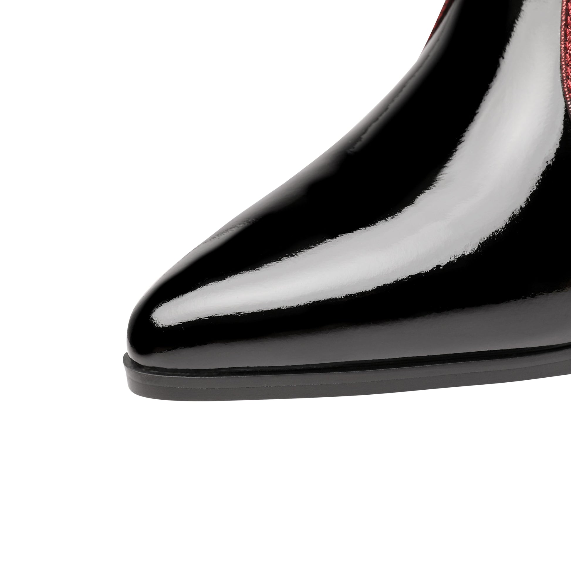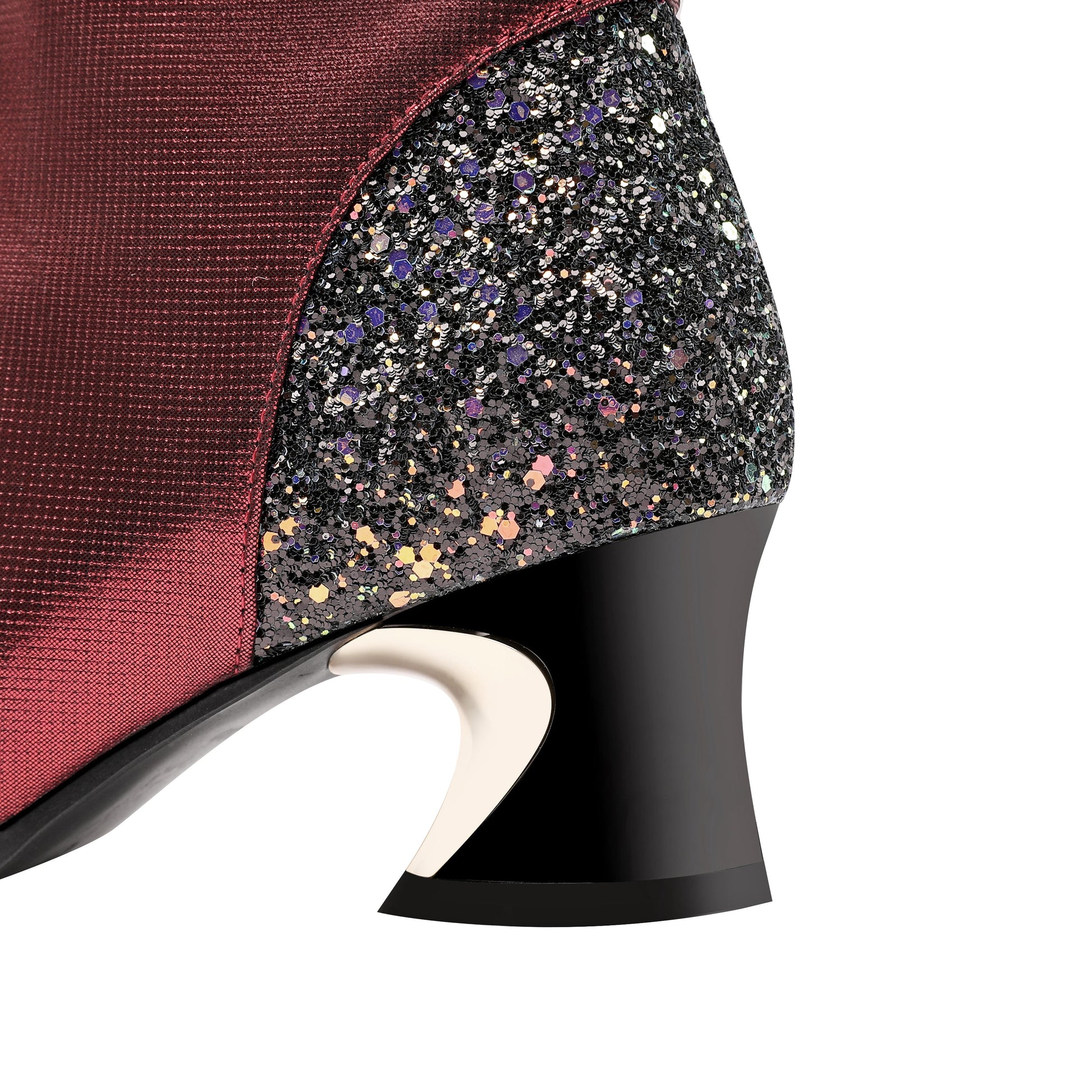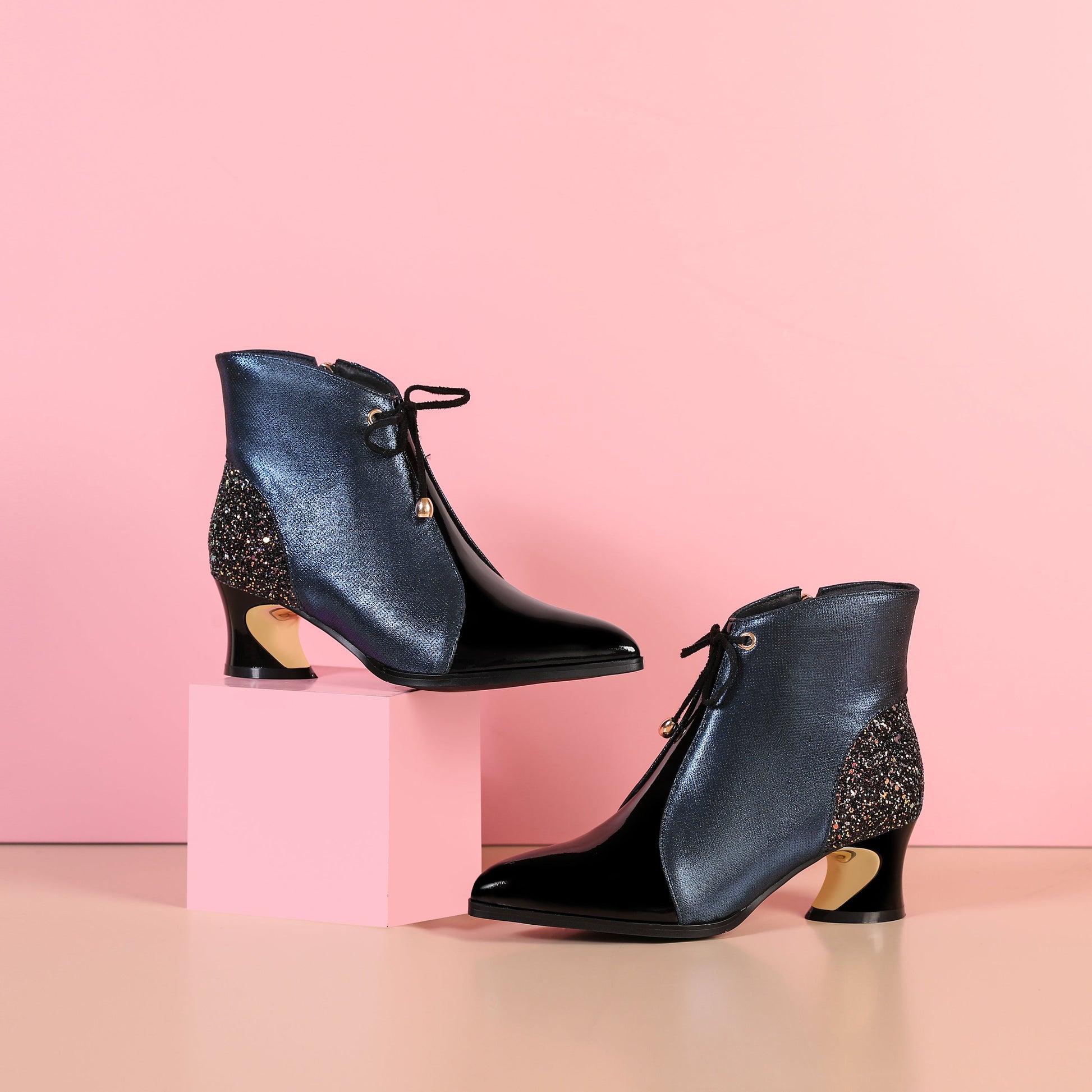 Modern ankle booties are designed with leather, clear pointed toe,chunky heel, side zip closure and glitter decor to keep up with fashion trend. These fashion shoes can go with many different styles of outfits.