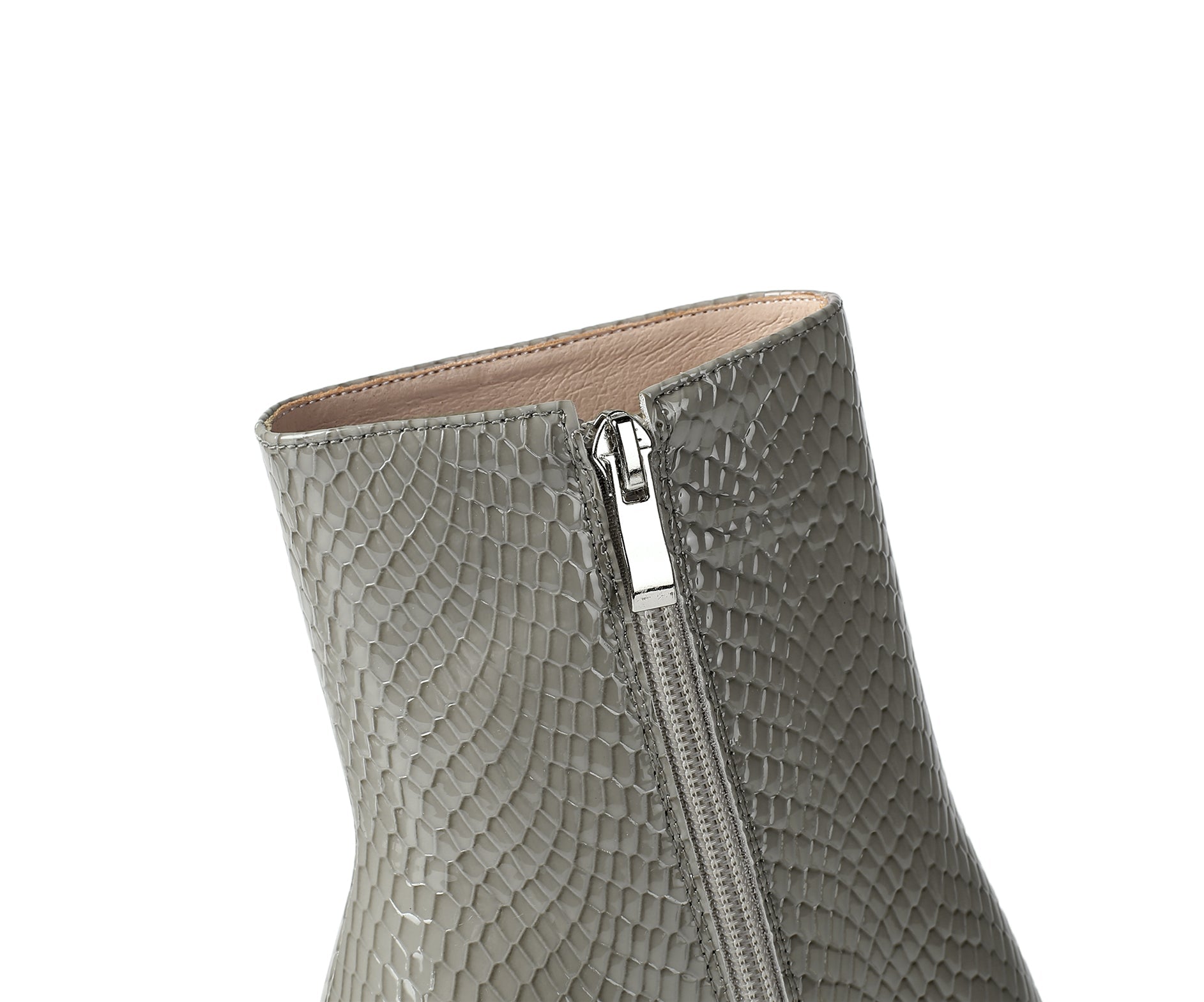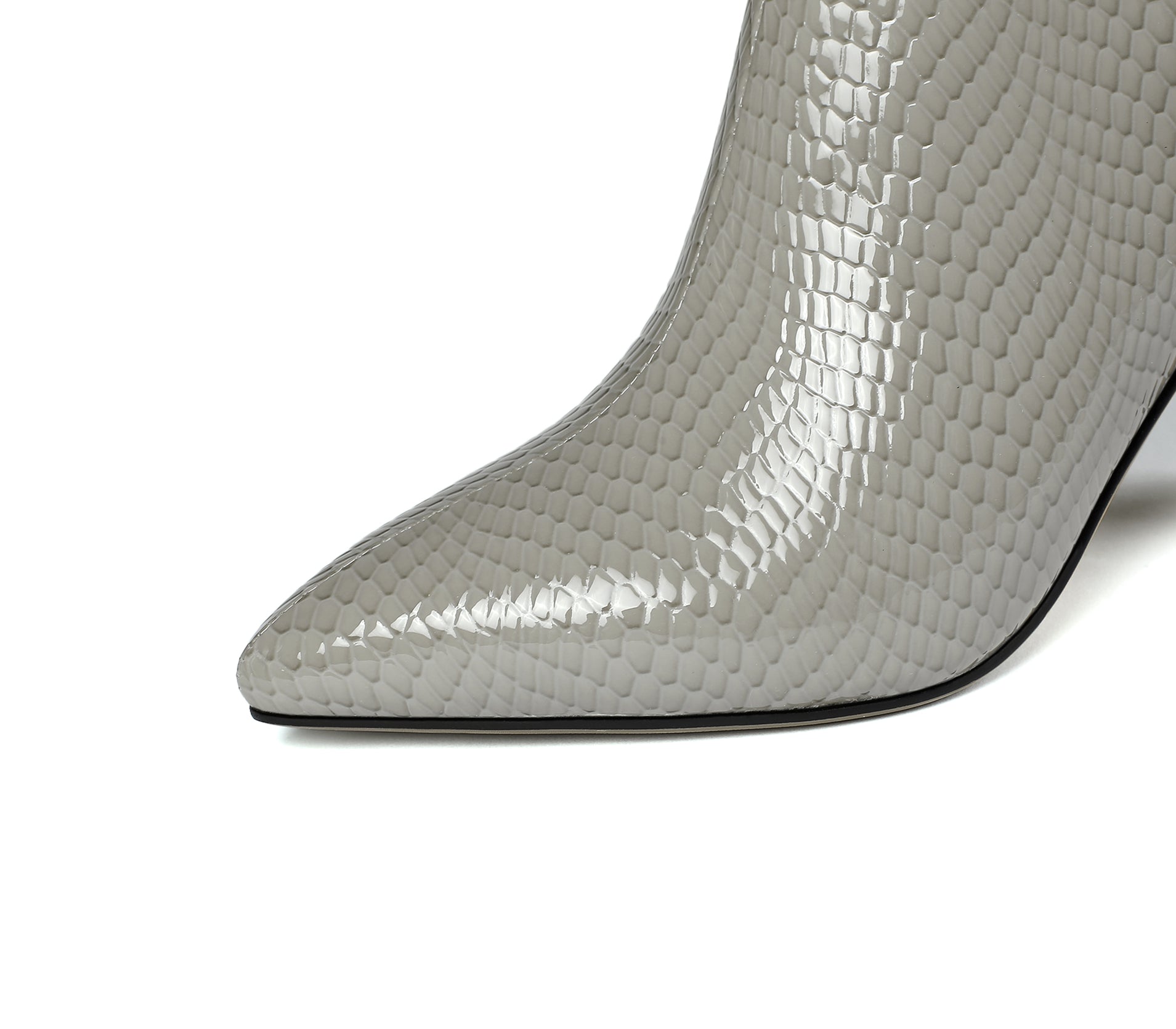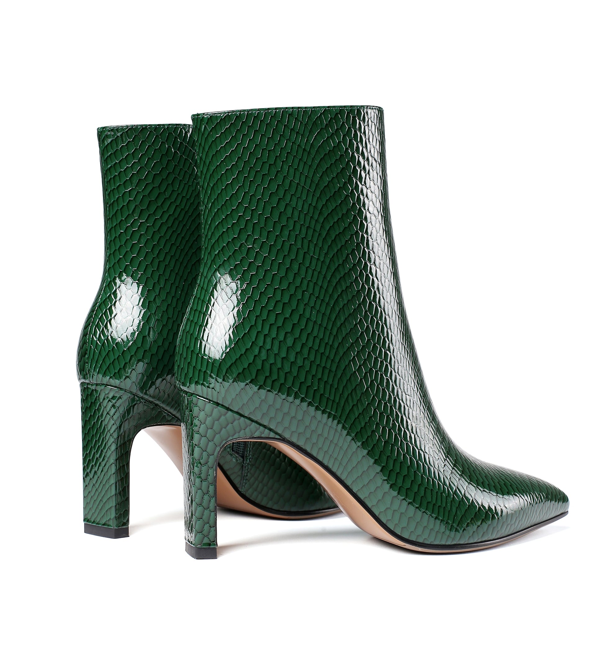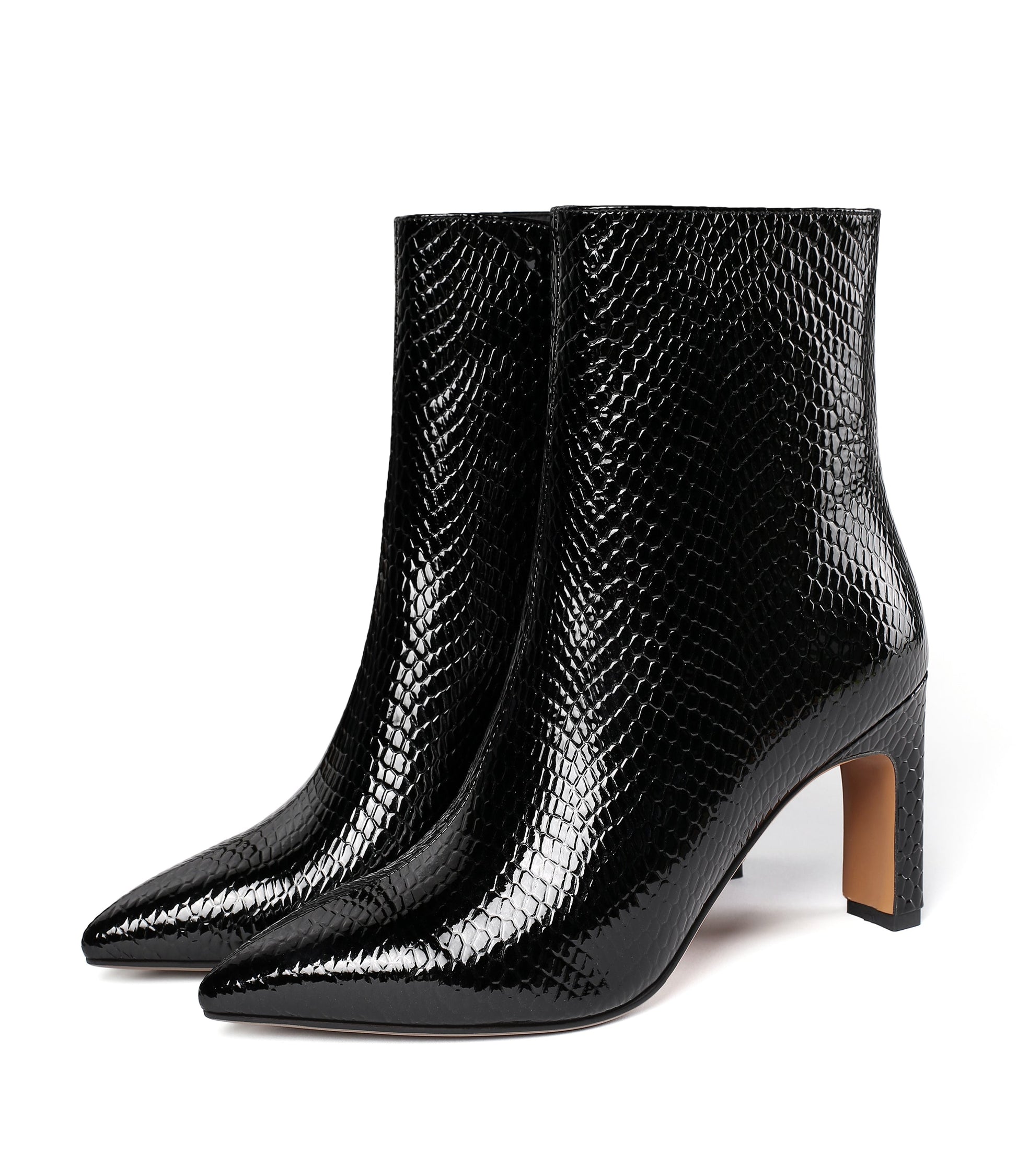 Dress ankle boots designed with patent leather, pointed toe, side zip and high chunky heel to keep up with fashion trend.