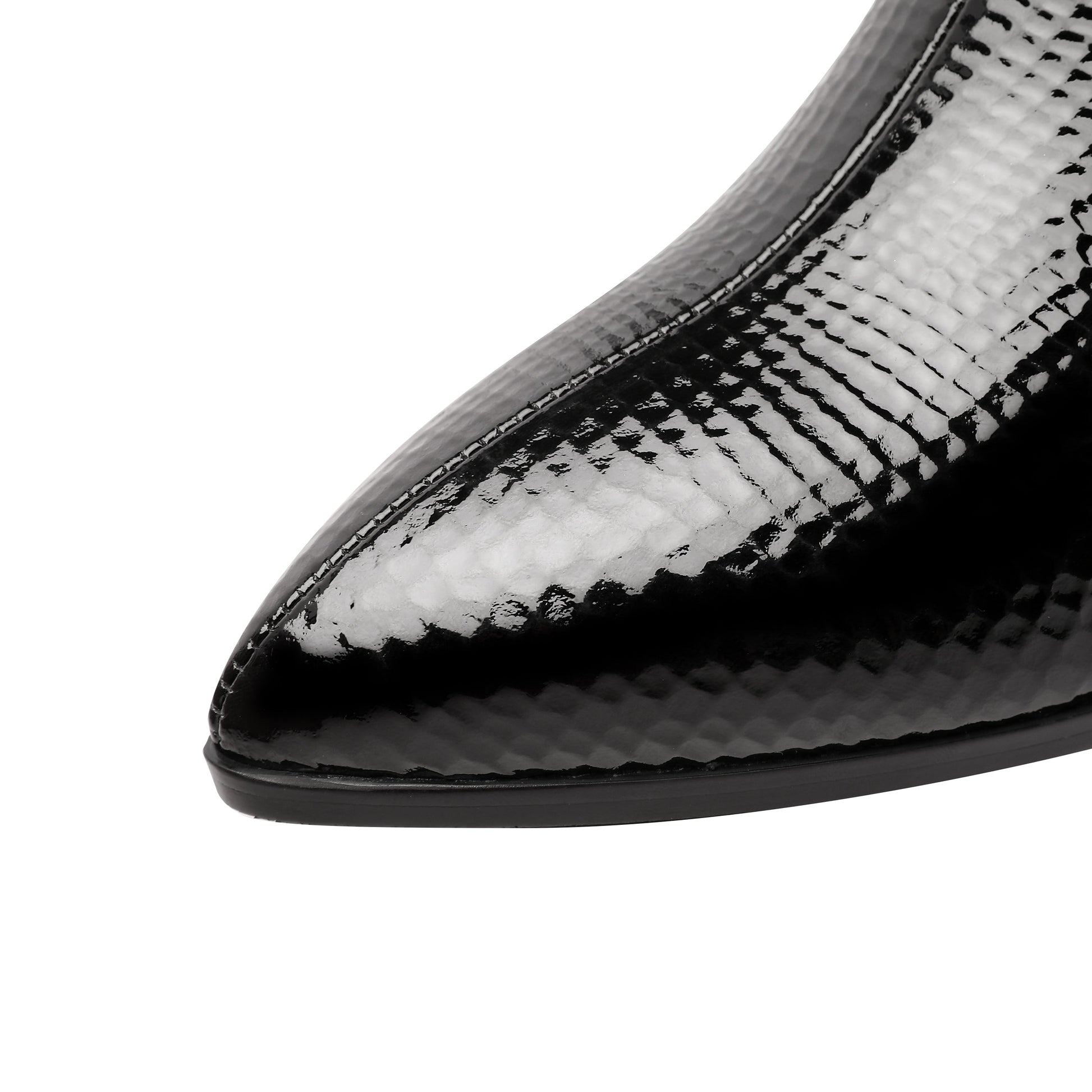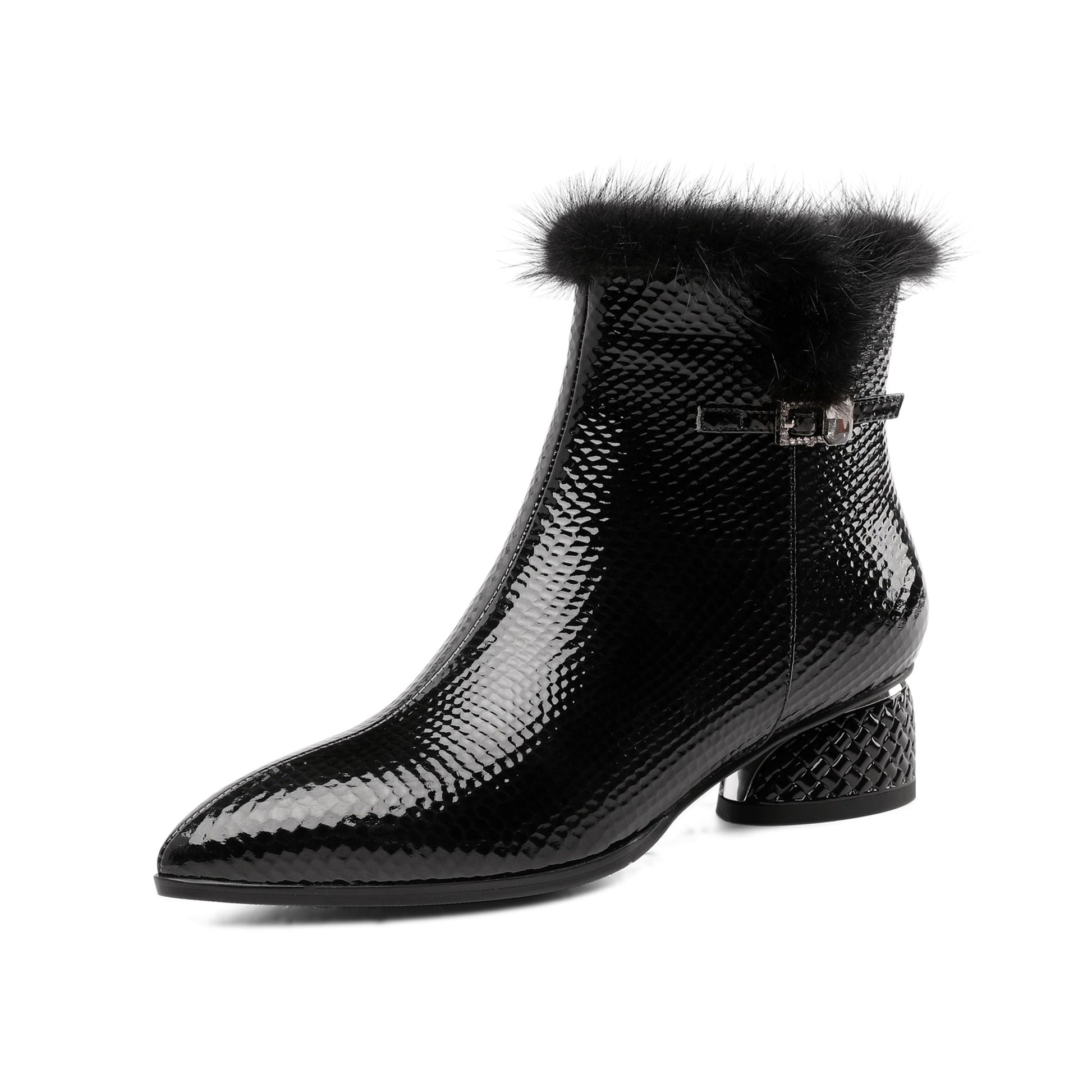 Stylish boots feature in patent leather, pointed toe,fur, rhinestone buckle decor and side zip closure.Soft insole could make you feel comfortable.