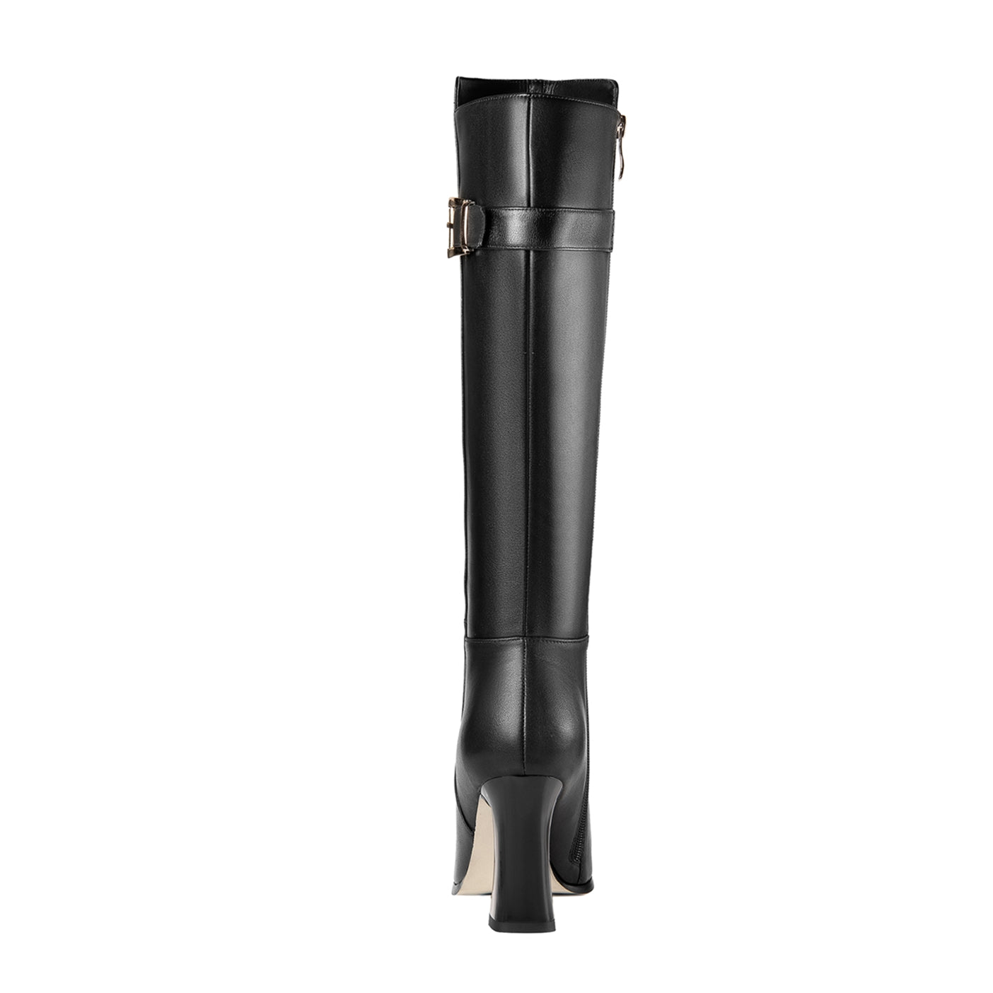 These boots are designed with genuine leather, pointed toe, high heel, side zip closure and chic buckle to keep up with fashion trend and give you visual enjoyment.