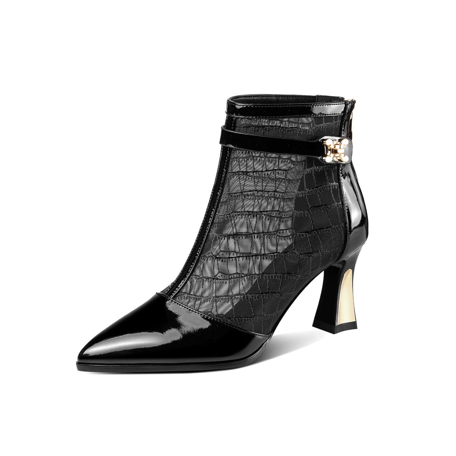 Nine Seven Women's Glossy Patent Leather Handmade Summer Mesh Mid Heel Back Zip Up Ankle Boots with Pointy Toe