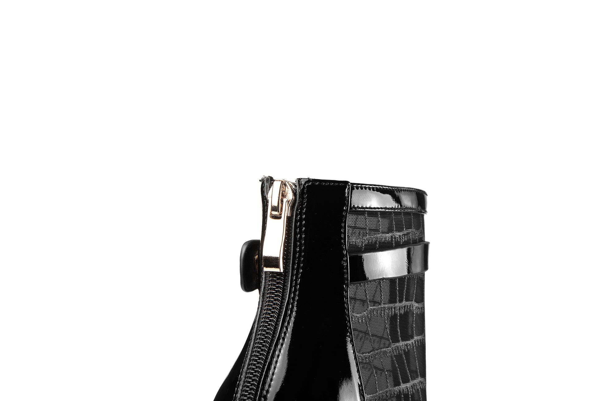 Stylish summer boots feature in patent leather, pointed toe,mid spool heel and zip up closure.Soft insole could make you feel comfortable.