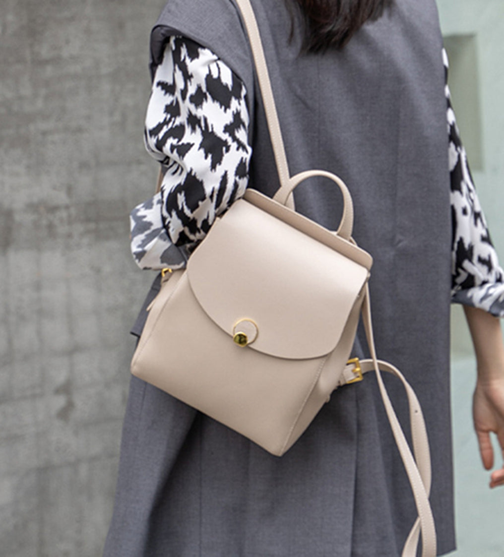 Genuine leather backpack features in easy button closure, safe zip and inner coin pocket.