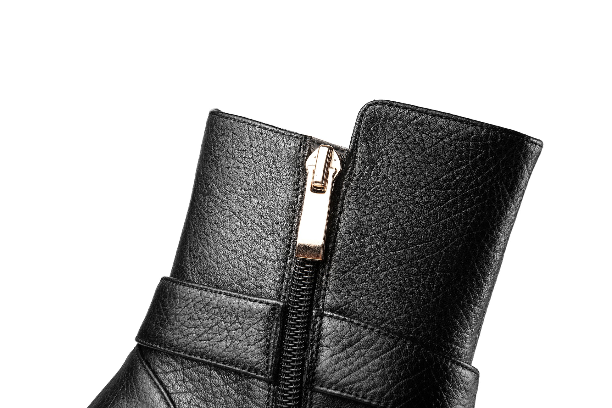 Genuine leather ankle boots deisgned with pointed toe, buckle, side zipper and inner heels to keep up with fashion trend