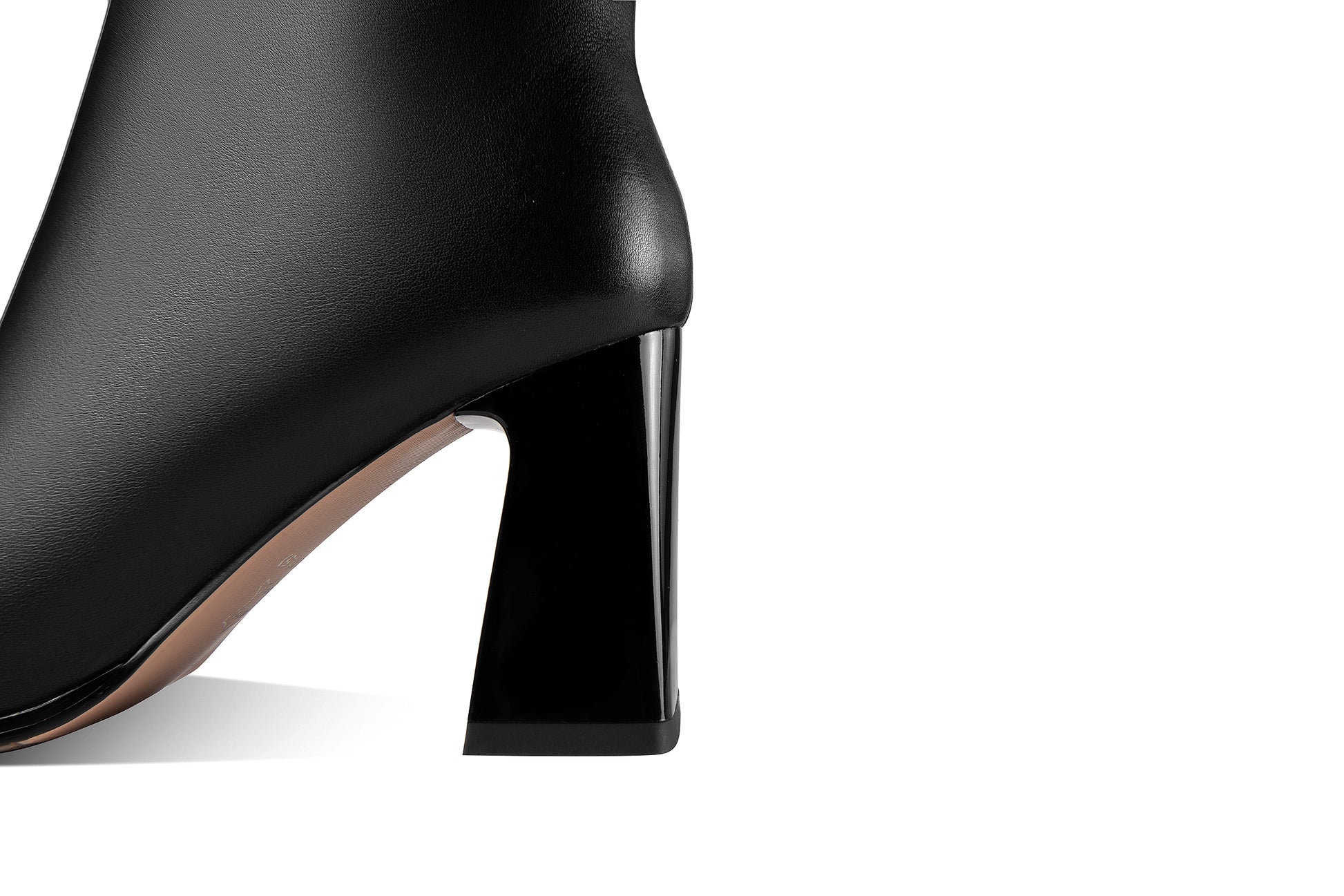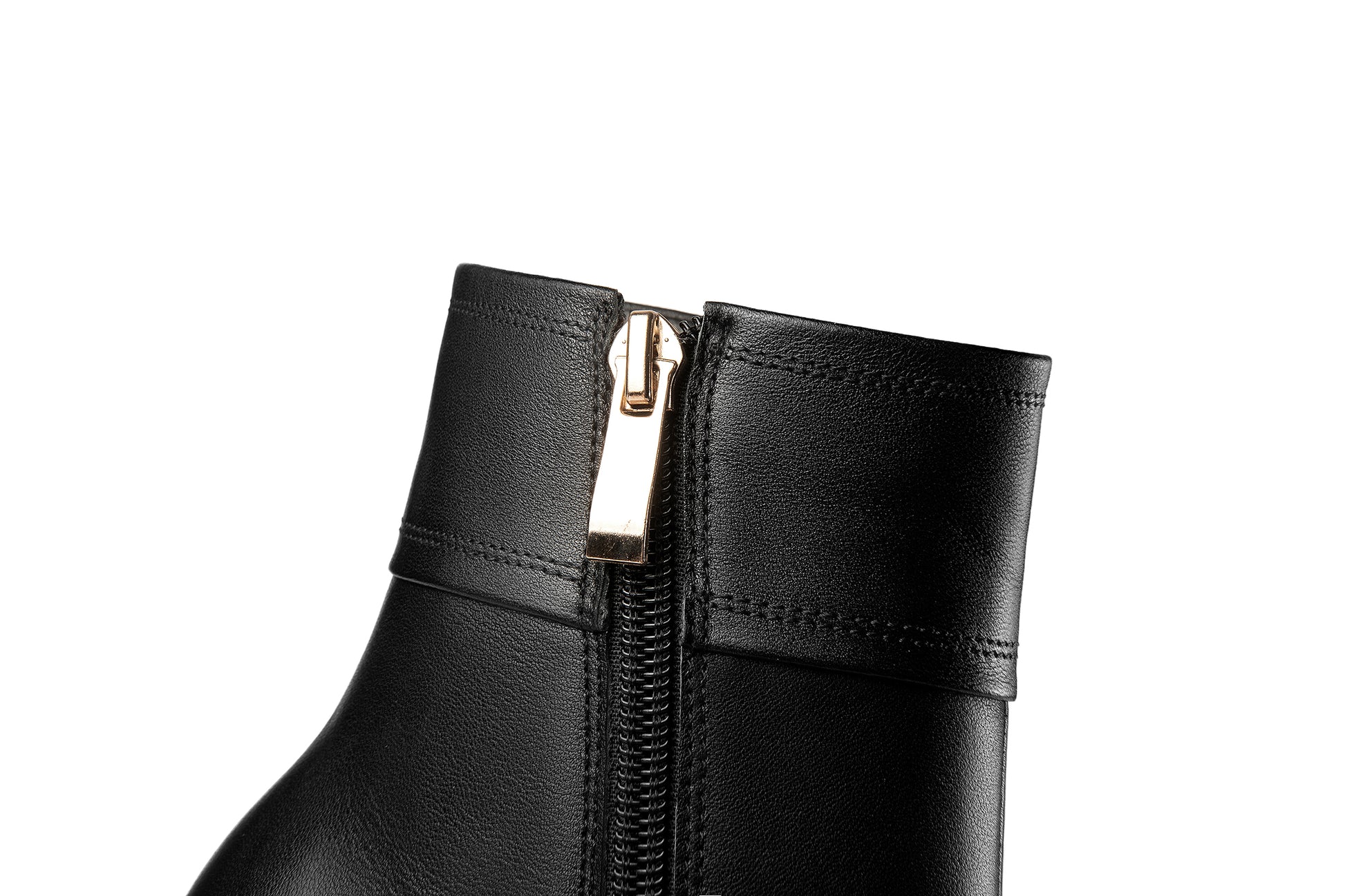 Genuine leather ankle boots designed with square toe, side zipper, metal décor and high chunky heels to keep up with fashion trend.